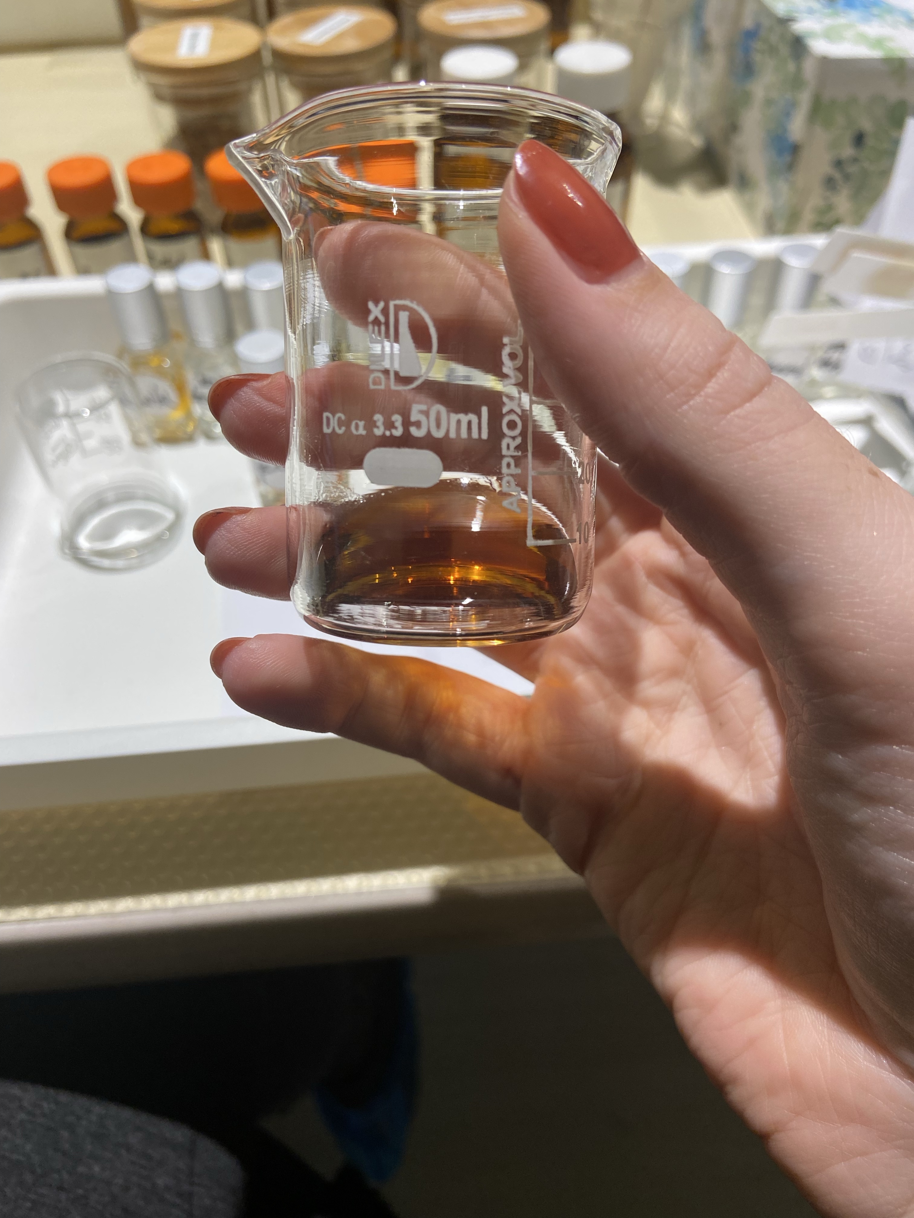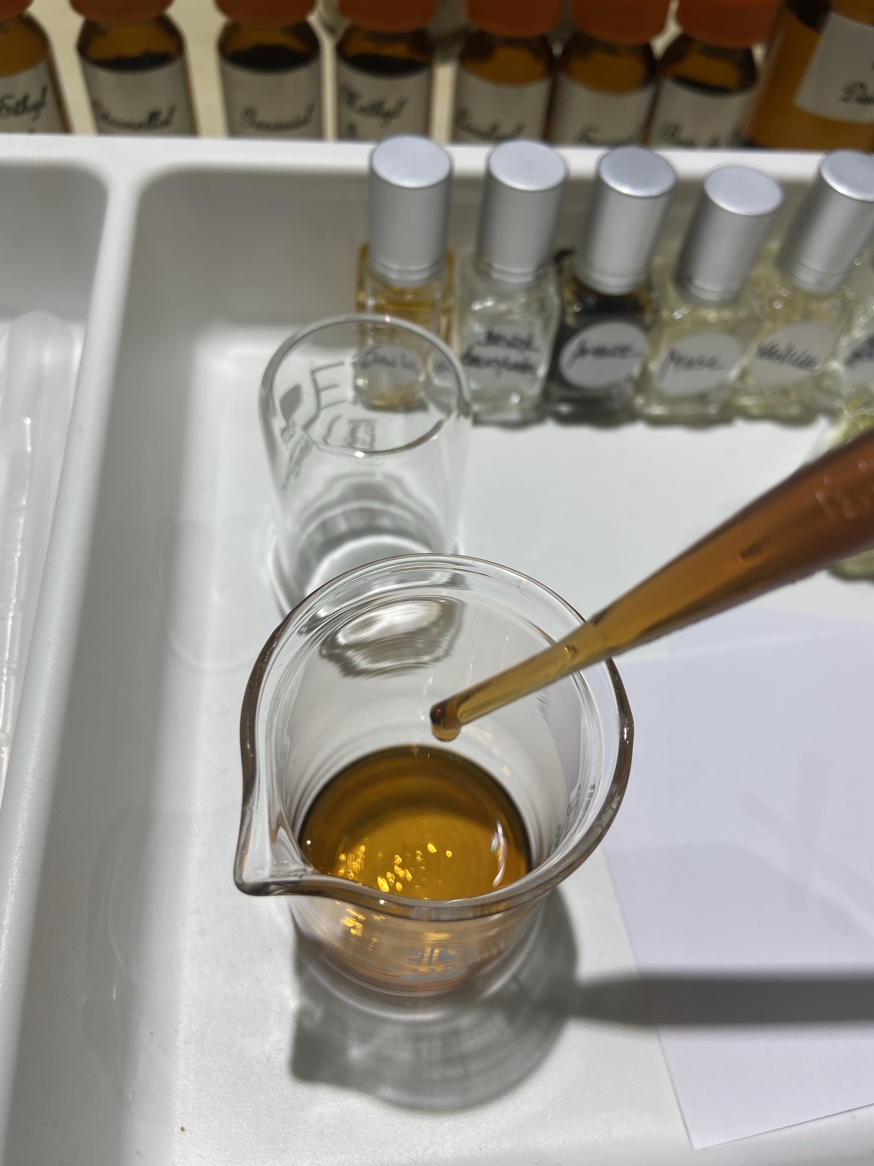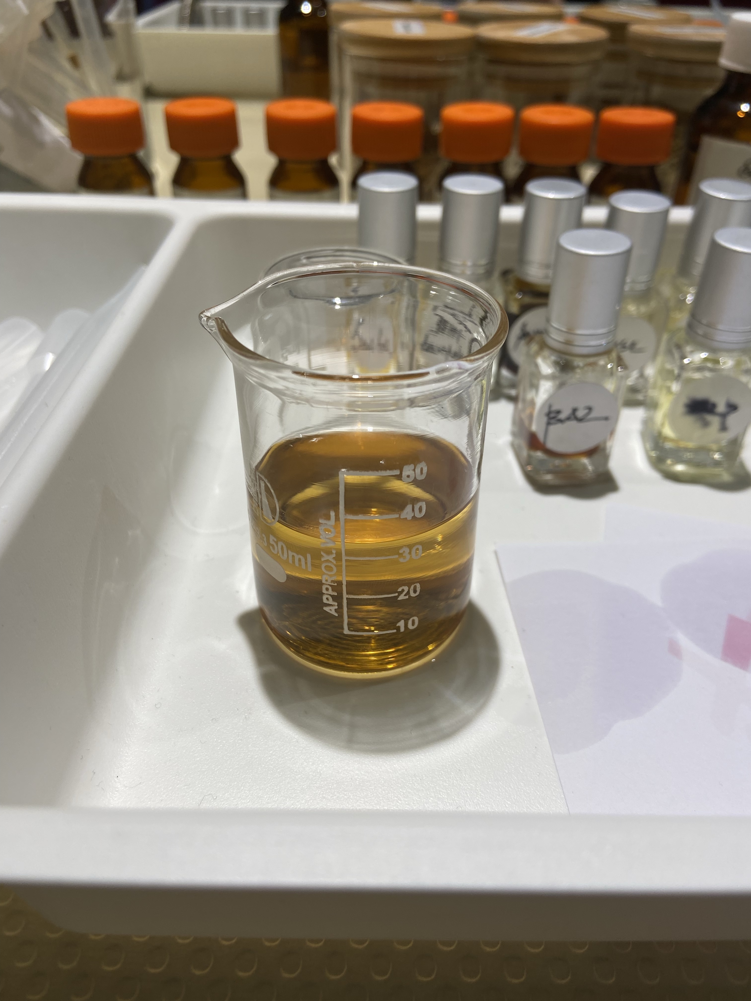 Birbirinden enteresan bilgilerle ve küçük, sürprizli deneylerle dolu saatler su gibi aktı geçti (ben tabii burada size hızlı oynat modunda geçtim), konuştuk, gülüştük, şaşırdık, bilgilendik ve geldik final kısmına. Önümüzde duran iki dizi şişeyi kullanma vaktimiz geldi: Önce bir gül akoru yapacak, sonra onu diğer akorlarla birleştirerek bir parfüm yapacağız! Tek bir akor bile birçok molekülden yaratılıyor; örneğin önümüzde duran kehribar renkli şişeler bir gül akoru yapmamız için gereken maddeleri içeriyorlar. (Ki Vedat Bey bunun “basit” bir gül akoru olduğunu söylüyor, aslında daha komplike olsa daha iyi olurmuş!) 7 ayrı şişenin içindeki sıvıları Vedat Bey’in verdiği reçeteye göre damlalıkla karıştırıyor, çalkalıyor, heyecanla kokluyoruz. Voila, işte bir gül aroması! Vedat Bey “Teninize direkt sıkmayın ama banyo suyunuza karıştırabilirsiniz bunu” dese de, birçok tatlıcıda güllaçların üstüne serpilen kötü kalite gül sularından daha sağlıklı olduğuna emin gibiyim nedense!