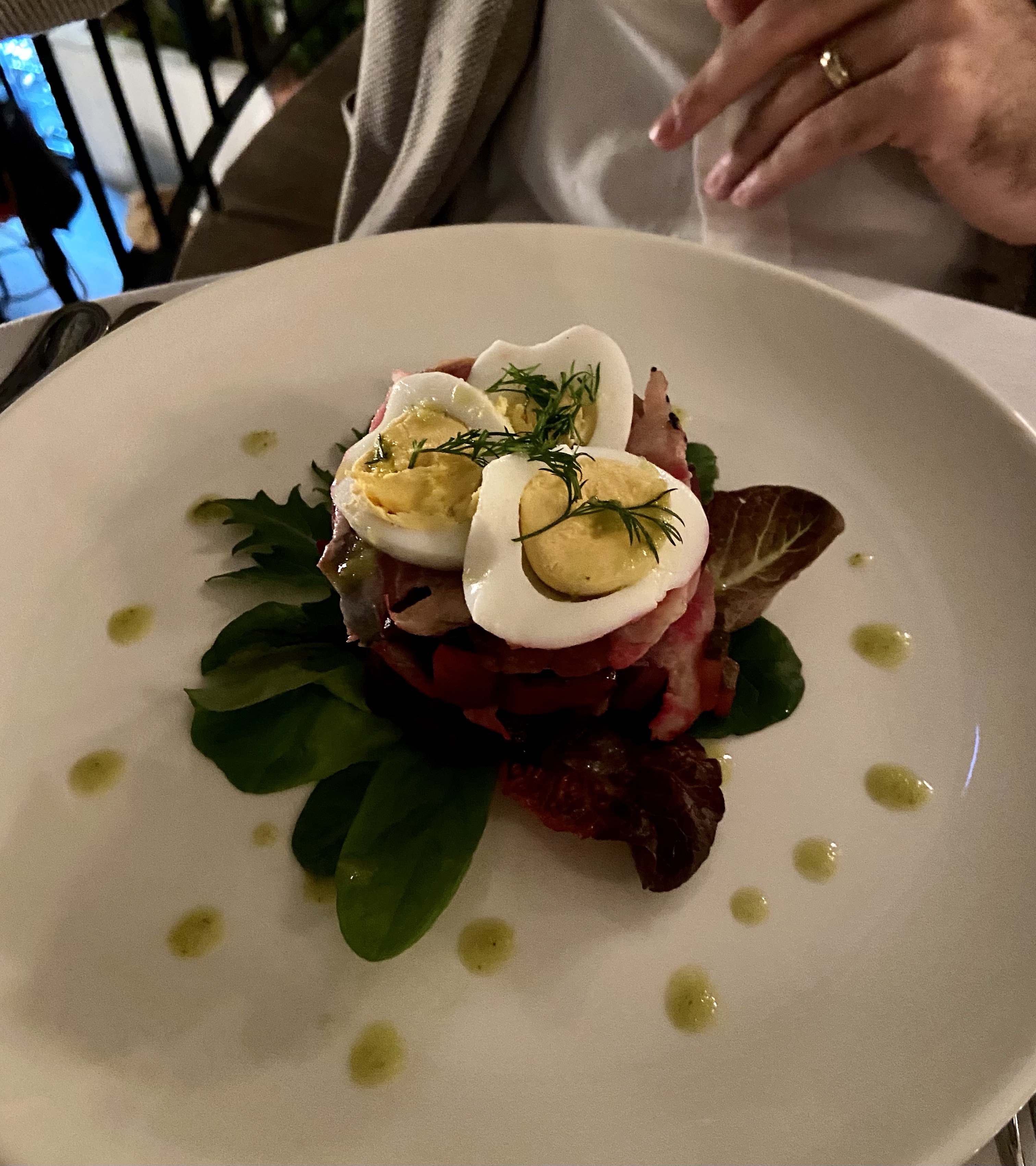 Fakat işte biz bu ilk şoku yiyene kadar mekana bayılmışız ya, “Ay ne güzel eve yakın, akşamları uğrar bir şeyler yer içeriz, bazen barda takılırız” diye konuşmuşuz ya, “Neyse” dedik, “moral bozmayalım, başka şeyler deneyelim”. Bu kez menüden ringa balığı salatası ve karides tempura seçiyoruz. Ringa balığı benim sevdiğim bir şey, hem de salata çok garanti, çünkü içinde hastası olduğum pancar var. Risksiz diye seçmişim yani. Fakat bir bakıyorum, önüme gelen salatada sos yok! Ne yağ, ne ekşi… Garsonu çağırıp yağ ve balzamik rica ediyorum, mutfaktan geliyor. Bir salatanın bütün olayı sos, ama bu bile atlanmış. Düzgünce soslanınca normal yenebilir bir hale geliyor. Balıkta bir sorun yok, pancar olması gerektiği gibi haşlanmış, ama yani bir salata nasıl soslanmadan servis edilebilir, bunu bilemiyorum.