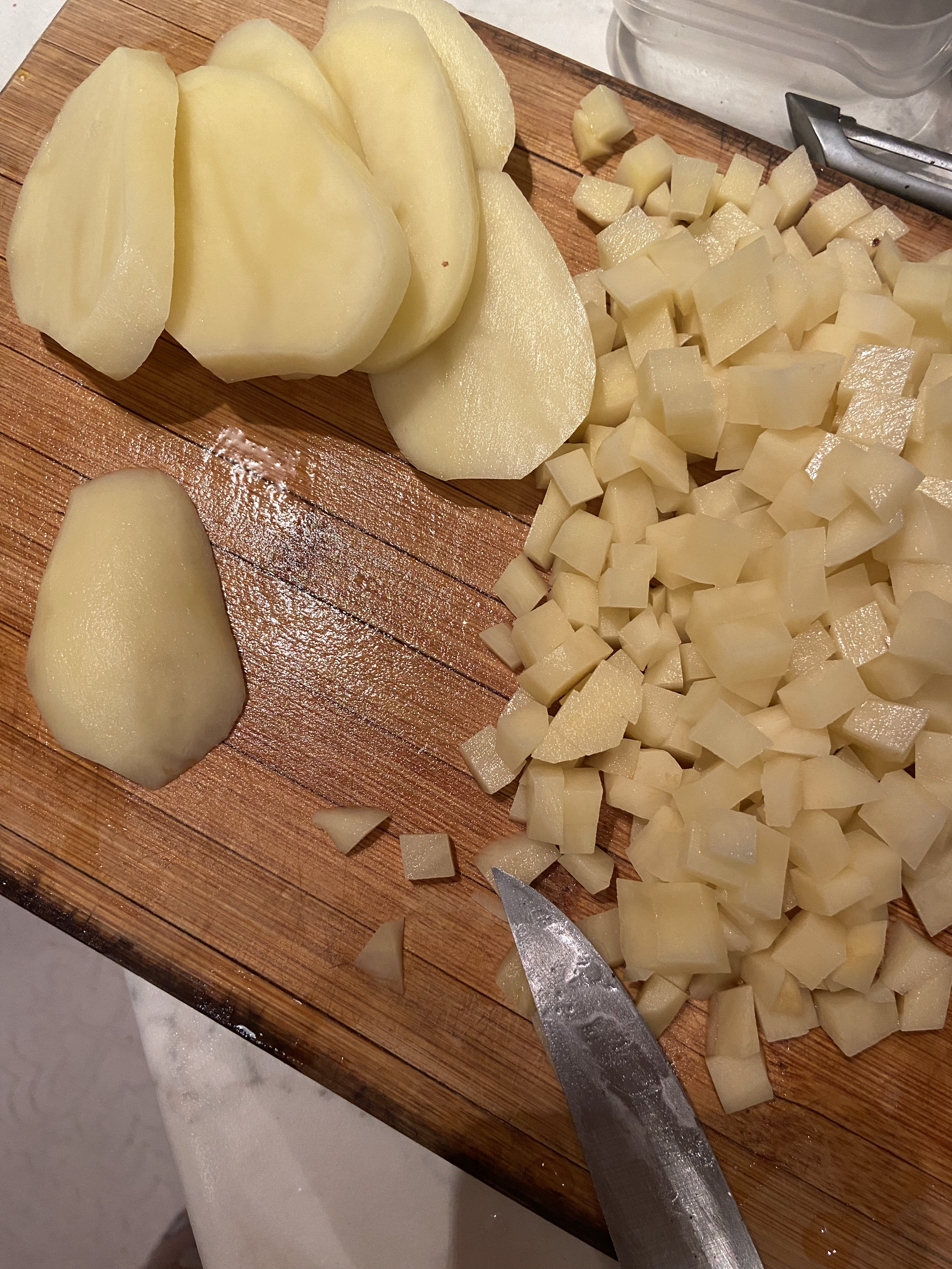 En güzel yanı bu çorbanın herhangi bir özel malzeme, alışveriş, pek gerektirmemesi… Havuç, patates, labne (veya krema, hadi olmadı süt) yeterli. Zira ben de dün canım çorba çekince evde çorbaya uygun ne varsa ondan yaptım. Önce 4-5 iri havucu (küçükseler sayı 7-8 olsun) rondoda çekin veya rendeleyin, 2-3 yemek kaşığı zeytinyağı ile çorba tenceresinde kavurmaya başlayın. Bu esnada 2 orta boy patatesi soyun ve tavla zarından büyük olmayacak kadar küçük küpler halinde doğrayın. Patatesi neden rendelemiyoruz ya da rondodan geçirmiyoruz derseniz patates sulanıyor ve nişastasını bırakıyor, kavurması çok zor oluyor, o yüzden onu doğruyoruz. Sonra hop tencereye! Biraz tuz da ekliyorum. Patateslerin yumuşamasına yakın, 8 diz kadar sarımsağı soyup doğrayıp tencereye alıyorum, biraz onlar da yağda çevrilsinler. Bu arada 1,5 litre suyu kaynatıyorum, kavurma tenceresine de gerektikçe yağ eklenebilir çünkü patates dediğimiz arkadaş yapışmaya meyilli sonuçta.