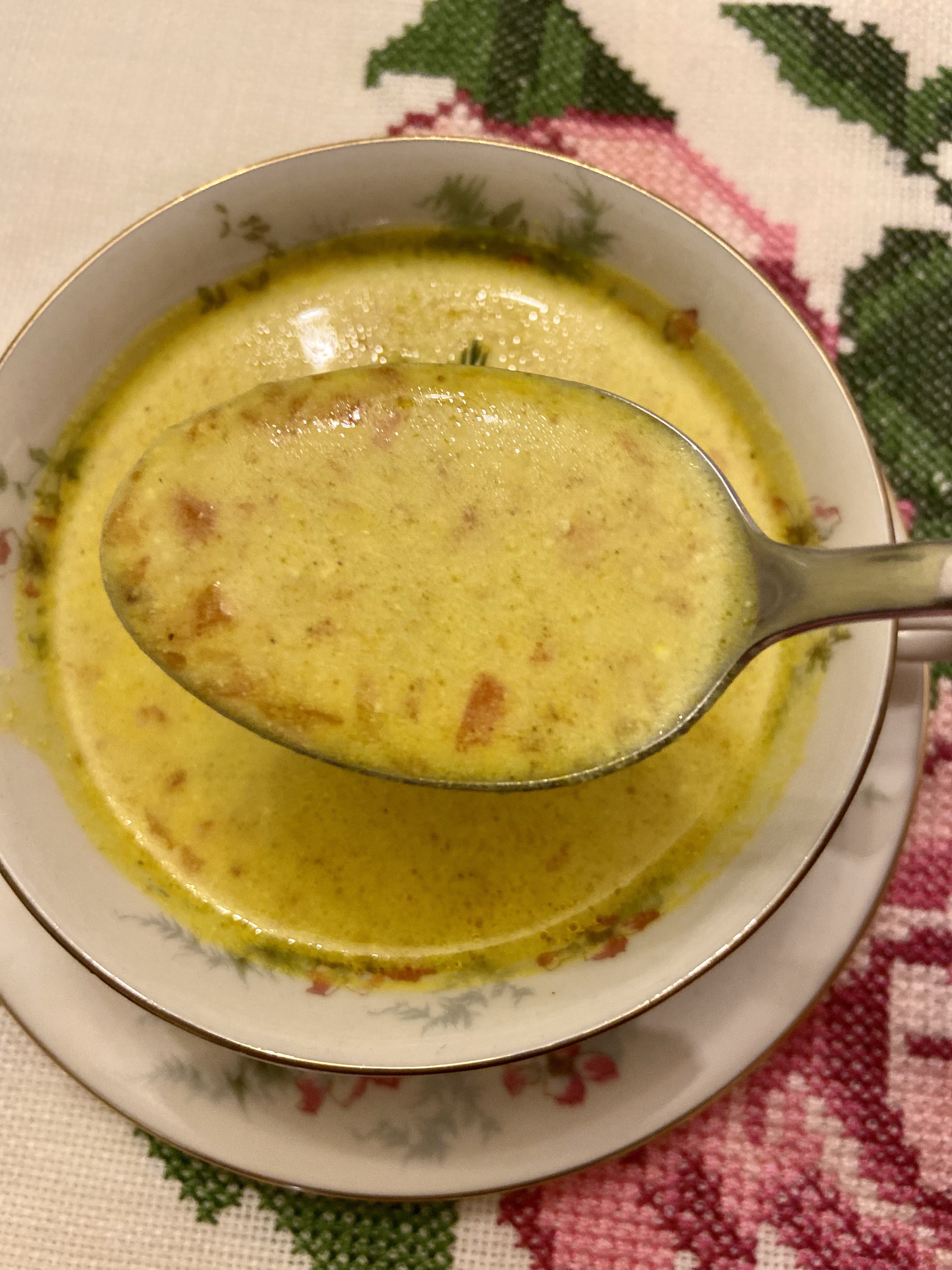 Evet bu kadar büyücülükten sonra, baharatları yağda bir iki çevirip 1.5 litre kadar kaynar su ekleyin ve bırakın 3-5 dakika kadar çorba tencerenin kapağı açık şekilde fıkırdasın. Sonra altını kısın, kaynar kaynar hali geçsin. Çorba göbek atmaz hale gelince 400 gram labneyi parça parça çorbaya katıp eritin. Labne yoksa, almaya da üşendiyseniz, yerine bir paket (200 ml) krema koyabilirsiniz. O da mı yok? Canınız sağolsun, o zaman çorbayı su yerine 1.5 litre sütle yapın ama süt bu diğer ikisi kadar yağlı olmadığı için bir çorba kaşığı da tereyağı ilave edin. Görüyorsunuz bizde tarifler insani, ikameli! Zira evlerimiz otel mutfağı değil, bizim de her an markete gidesimiz olmuyor. Ha ama en iyi sonuç için tabii önerdiğim tüm baharatları ve labneyi tercih etmenizi söyleyebilirim, zira labnenin çok hafif ekşiliği kremadan az daha farklı bir sonuç veriyor tabii. Hem labne hem kremayı çorbanın kaynarlığı geçtikten sonra ekleyin ki kesilme riskini bertaraf etmiş olalım.