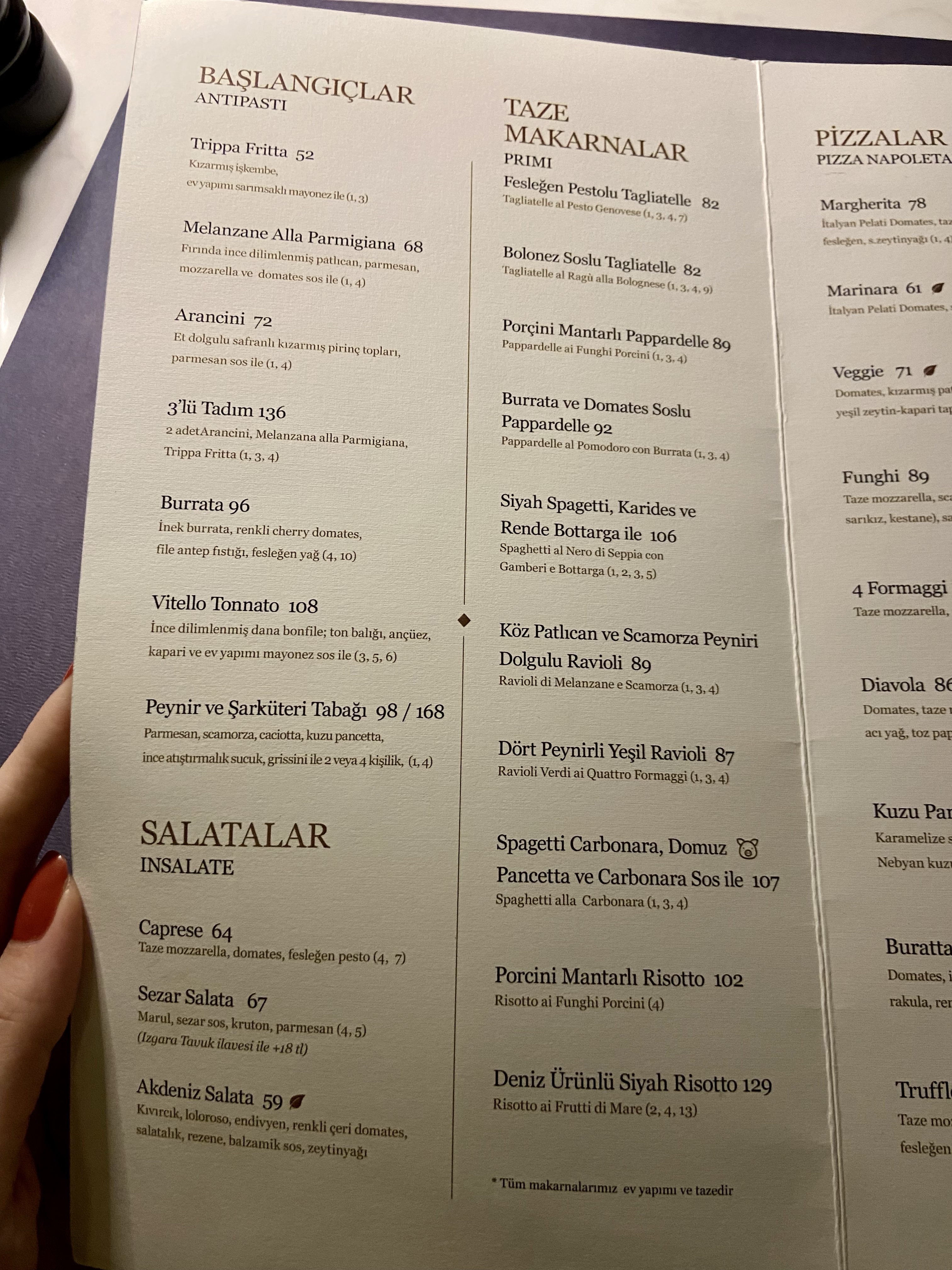 Sıra carbonaraya gelince ise artık belirgin şekilde mutsuz oldum doğrusu. Carbonara, yumurta, Pecorino romana, karabiber ve guanciale’den yapılan bir makarna sosu. Guanciale ne derseniz, domuzun yanak, çene kısmından alınan etlerle yapılan bir tür şarküteri. Bu makarnada pancetta kullanılmış onun yerine. (Pancetta da domuzdan yapılıyor ama hayvanın göbek bölgesi kullanılıyor.) Esasen birbirinin ikamesi olarak kullanılabilen ürünler, o yüzden bunu dev bir sorun olarak görmüyorum, özellikle Türkiye’de. Ancak, bir carbonara’da asla krema tadı almıyor olmalıydık, bu tabaksa hepimize kendisini bir kutu krema yiyormuş gibi hissettirdi. Kullanılan pancettanın tadı gayet güzel olmasına rağmen tabaktan keyif alamadık maalesef. Gecenin en zayıf tabağı bence buydu, ama diğerleri de doğrusu pek iyi değildi; anlayacağınız aradığımızı bulamamıştık.