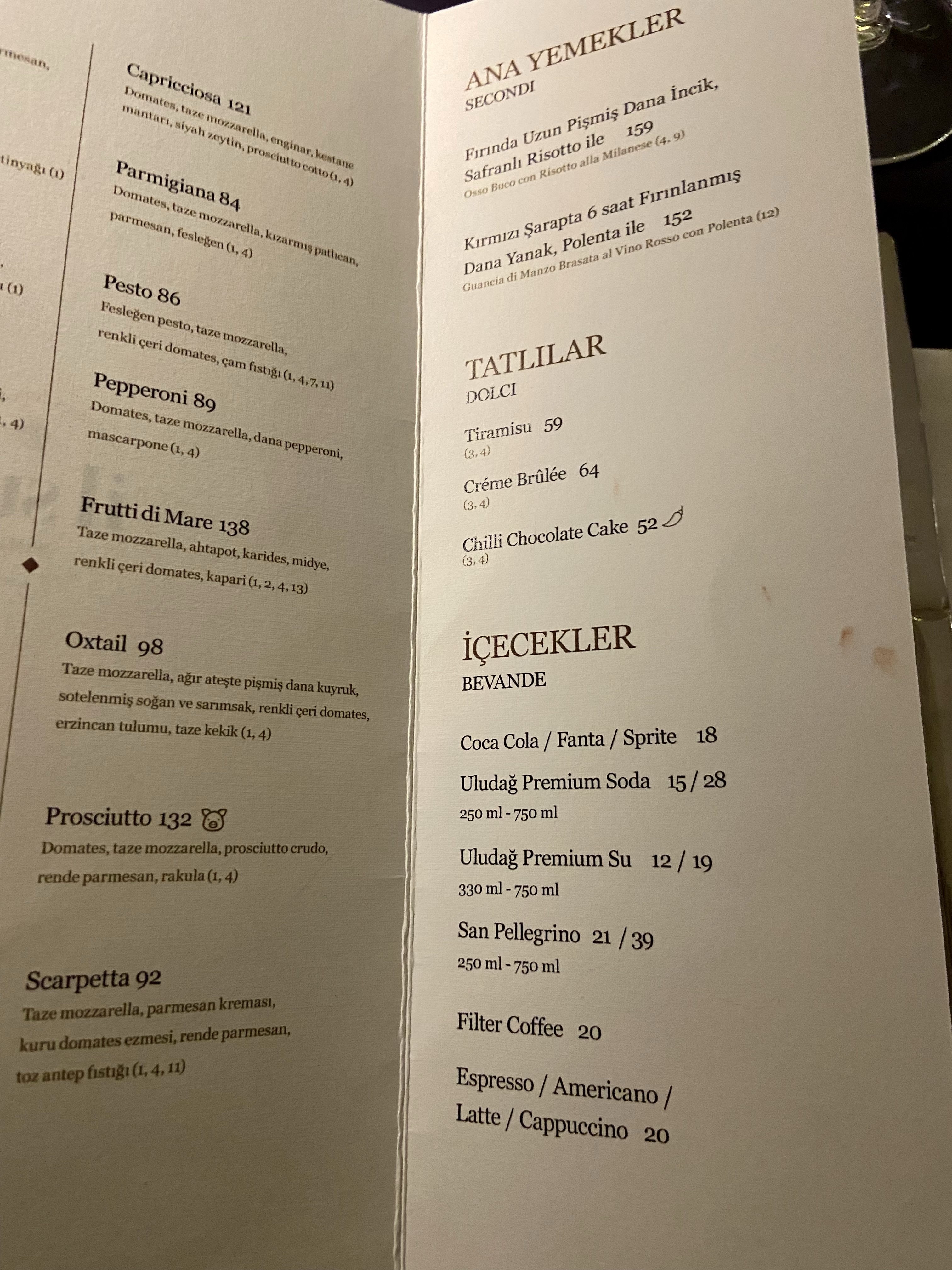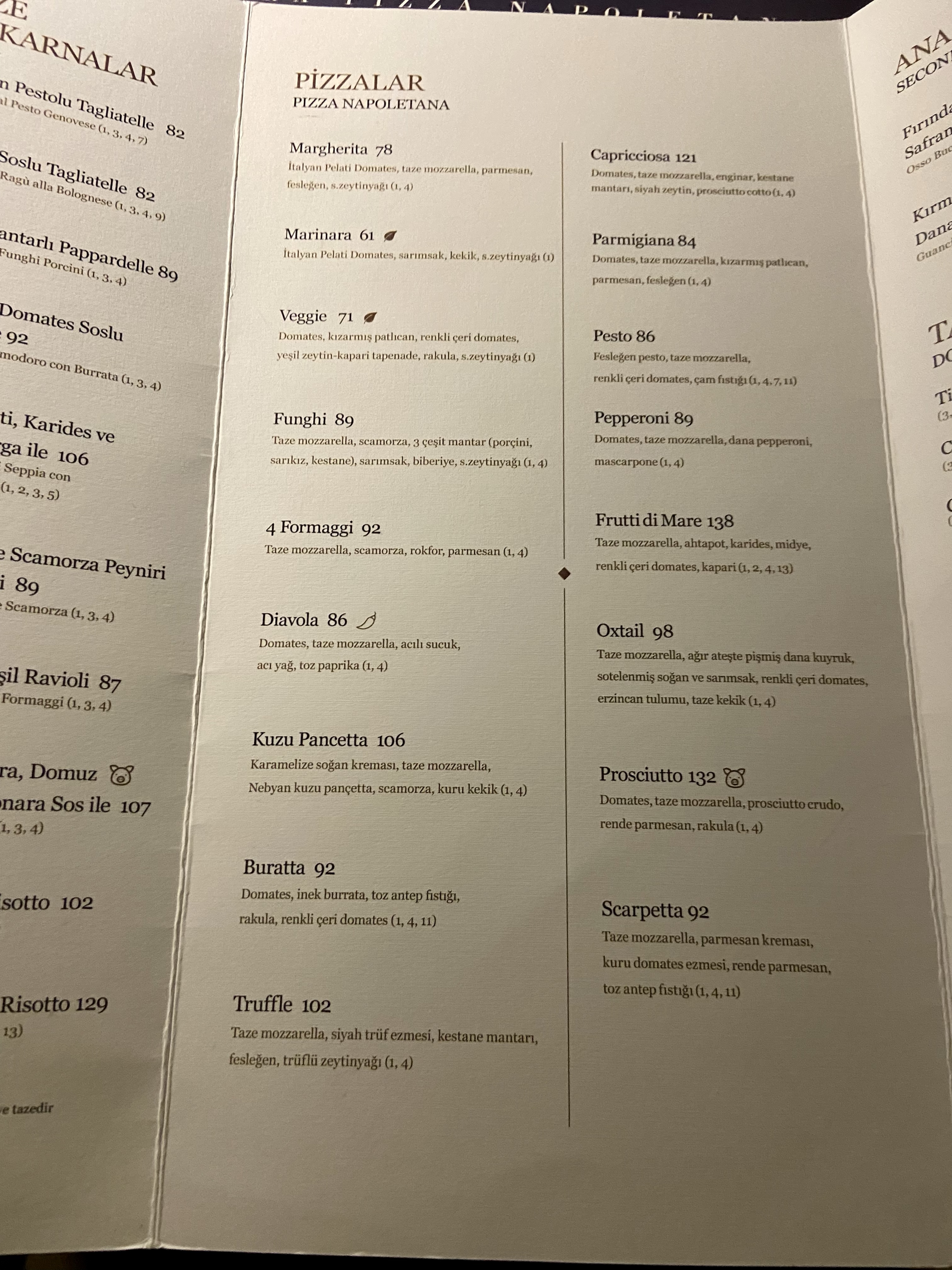 Trüflü pizza, mozzarrella, trüflü zeytinyağı, siyah trüf ezmesi ve kestane mantarıyla hazırlanıyor ve bu bileşim aslında kulağa çok çekici geliyor. Ama maalesef tat olarak beklediğimizin çok altındaydı. Pizzanın hamuru ve pişme seviyesi güzeldi aslında, belli ki iyi bir fırınları var, fotoğrafından da anlayacağınız üzere Napoli tipi pizza yapıyorlar. Ancak trüf tadı o kadar belirsizdi ki, iyi bir trüf kullanmadıklarına eminim. Normalde sadece iyi bir trüflü zeytinyağı bile oldukça etkili olurken, siyah trüf ezmesi içerdiği iddia edilen bir pizzadan bu kadar az trüf tadı gelmesi ancak kullanılan ürünün aromasının iyi olmamasıyla mümkün sanırım. Peynir miktarı da pek yeterli değildi, çok ince bir katman vardı hamurun üstünde, dolayısıyla tadı çok yavan kalmıştı.