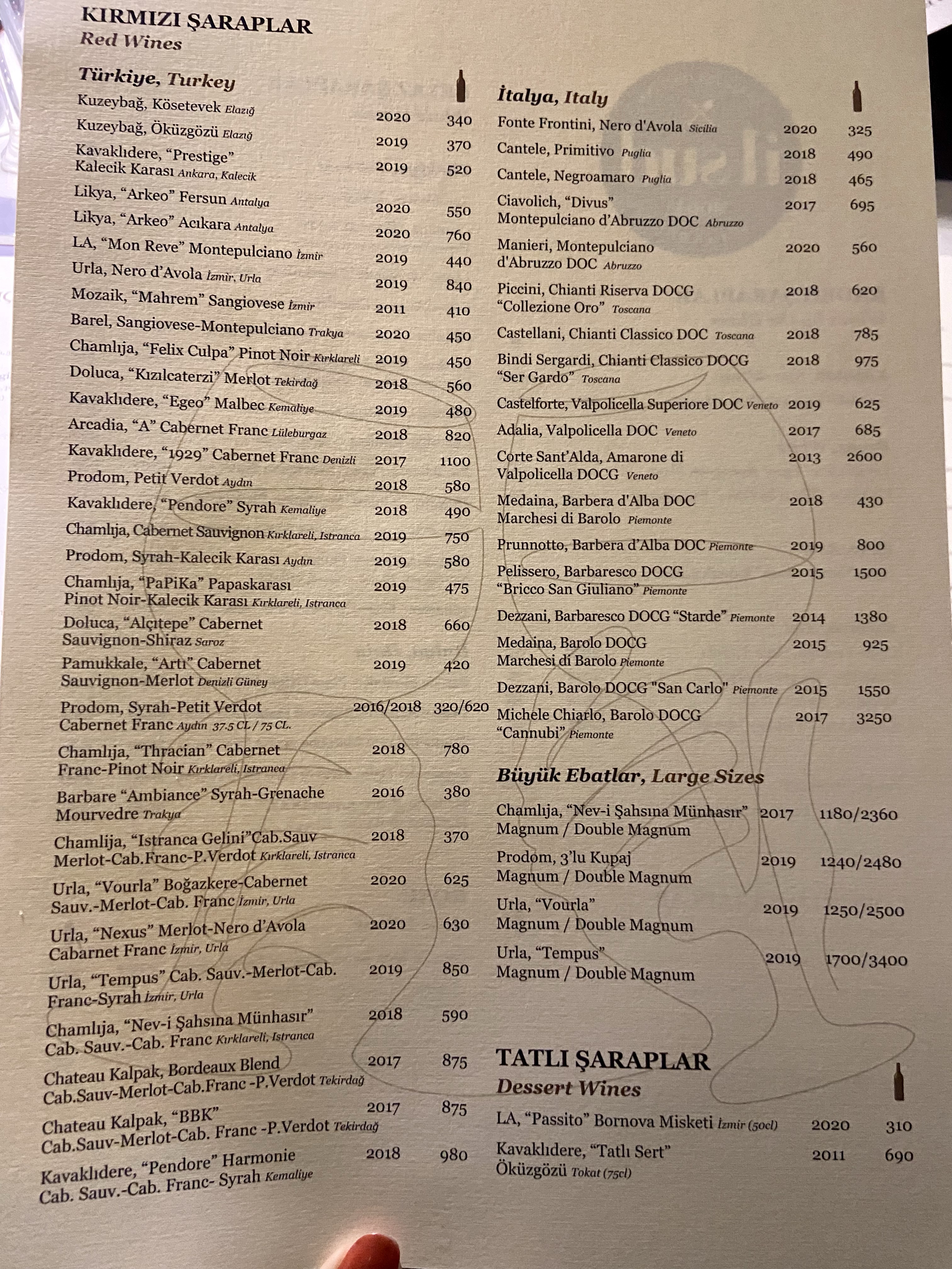 Bizi masada üzen bir diğer şeyse Chamlija’nın Riesling’i oldu. İlk kez bir Chamlija şarabını hiç ama hiç beğenmedim. Şimdiye kadar içtiğim her Chamlija şarabından çok memnun kalmıştım, fiyat politikalarını saymazsak ve sadece lezzet olarak bakarsak bence çok güzel şaraplar üreten bir firma. Ancak Riesling 2021 o kadar olmamış, o kadar olmamış ki… Şarabı tattığımızda dördümüzün de yüzü buruştu. Müthiş dengesiz, bir Riesling için fazla asitli, fazla mineralli, meyvemsi ve çiçeksi notaların çok çok az hissedilebildiği bir şaraptı, çok hayal kırıklığına uğradık. Muhtemelen önceki rekolteleri çok beğenildiği için iyi bir ünü var, her yılın da birbiriyle aynı olması zaten imkansız, ama deneyecekseniz en azından başka bir yılın rekoltesini denemenizi önereceğim bir şarap. Sonrasında yeni bir şey denemekten vazgeçip canım 7 Bilgeler Anaxagoras’a döndük de ağzımızın tadı düzeldi… Mekanın şarap konusunda hakkını teslim edeyim, iyi üreticilerden belli ki özenle oluşturulmuş şarap menüsü.