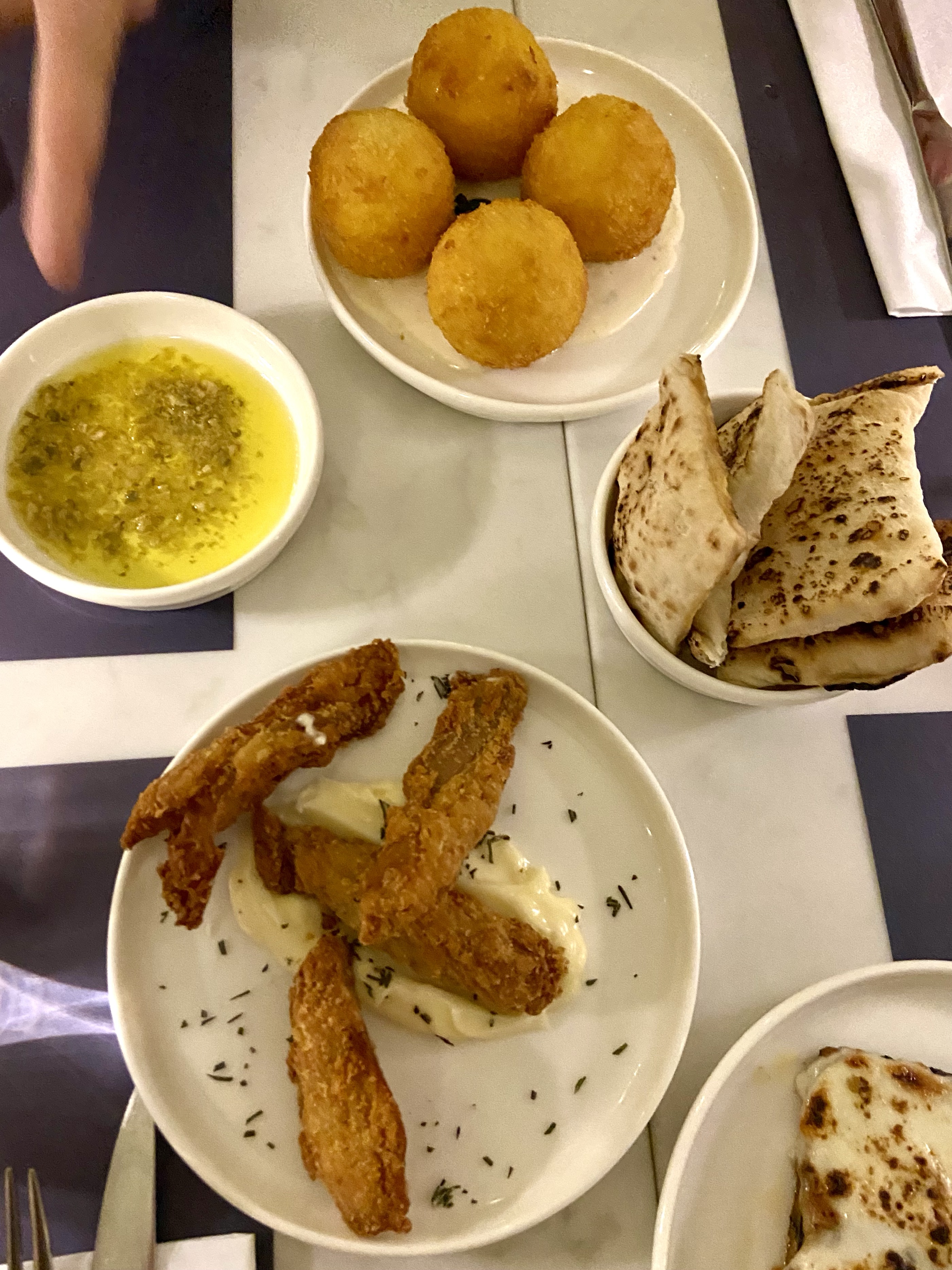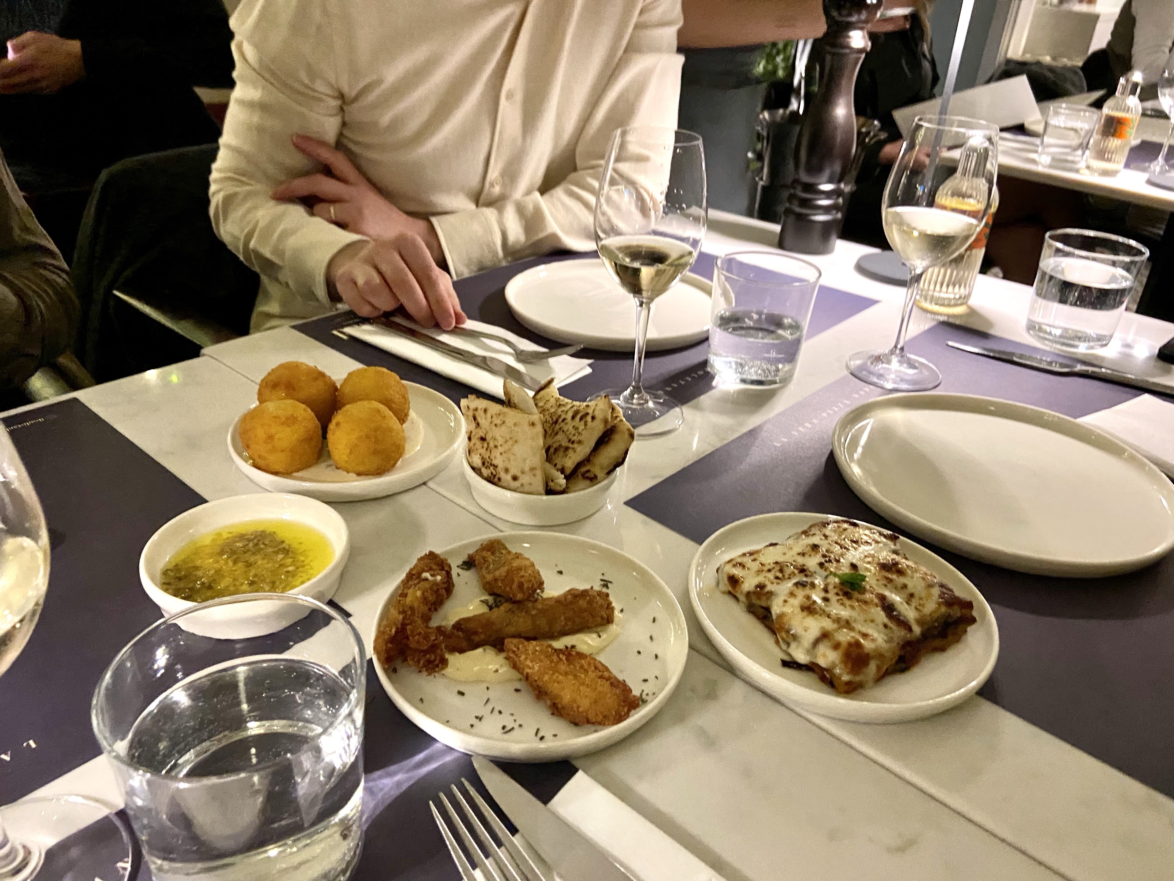 Başlangıç olarak üçlü tadım tabağından söyledik. Birincisi melanzana alla parmigiana idi, yani domates soslu, mozzarellalı, parmesanlı patlıcan sarma; ki bence gece boyunca masaya gelen en lezzetli şeyler bunlardı. İkincisi trippa fritta idi, kızarmış işkembe. Ben dokusu sebebiyle işkembeden çok hoşlanmam (kaygan dokulu şeylerle aram çok iyi değil) ama bu şerit kesilip galeta ununa bulanarak kızartılan işkembe parçalarını rahatlıkla yedim. Yanındaki sarımsaklı mayonez de başarılıydı doğrusu. O yüzden işkembe sevmiyorsanız bile denemenizi önerebilirim. (Ve, başarılı tabaklar burada bitiyor…) Üçüncü olarak gelen ise arancini idi, ortasına et parçaları konmuş, kızartılmış pirinç toplarına bayılırım (zaten pirince bayılırım) fakat bu maalesef yediğim en kötü arancinilerdendi, oldukça tatsız tuzsuz bir şey servis edildi. Fakat üç tabaktan ikisi iyi olduğu için tabii ki sorun etmedik.