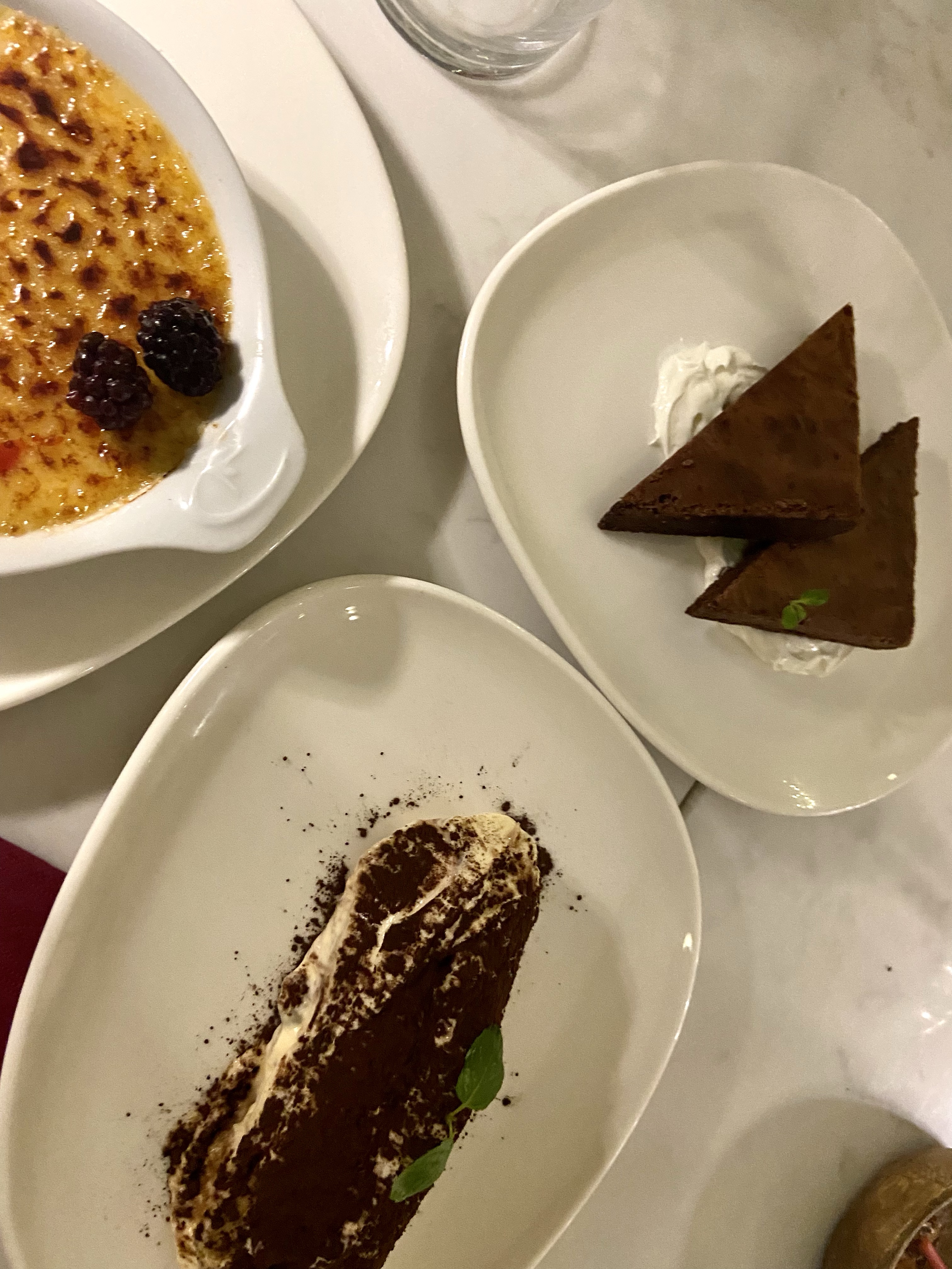 Bu bir doğum günü yemeği olduğu için sofrayı tatlısız bitirmek olmazdı. Tatlılardan hangisini istediğimizi seçemeyince, 4 kişi olmamıza güvenip üçünden de istedik. Tiramisu tamamen ehhh’ti, ama crème brûlée fena değildi. Acılı çikolatalı kek ise bence en başarılısıydı, acı tadı oldukça az olmakla birlikte kekin dokusu ve çikolata tadı çok iyiydi. Ancak doğrusu her üç tatlının da fiyatını biraz abartılı bulduğumu itiraf etmem gerekir.