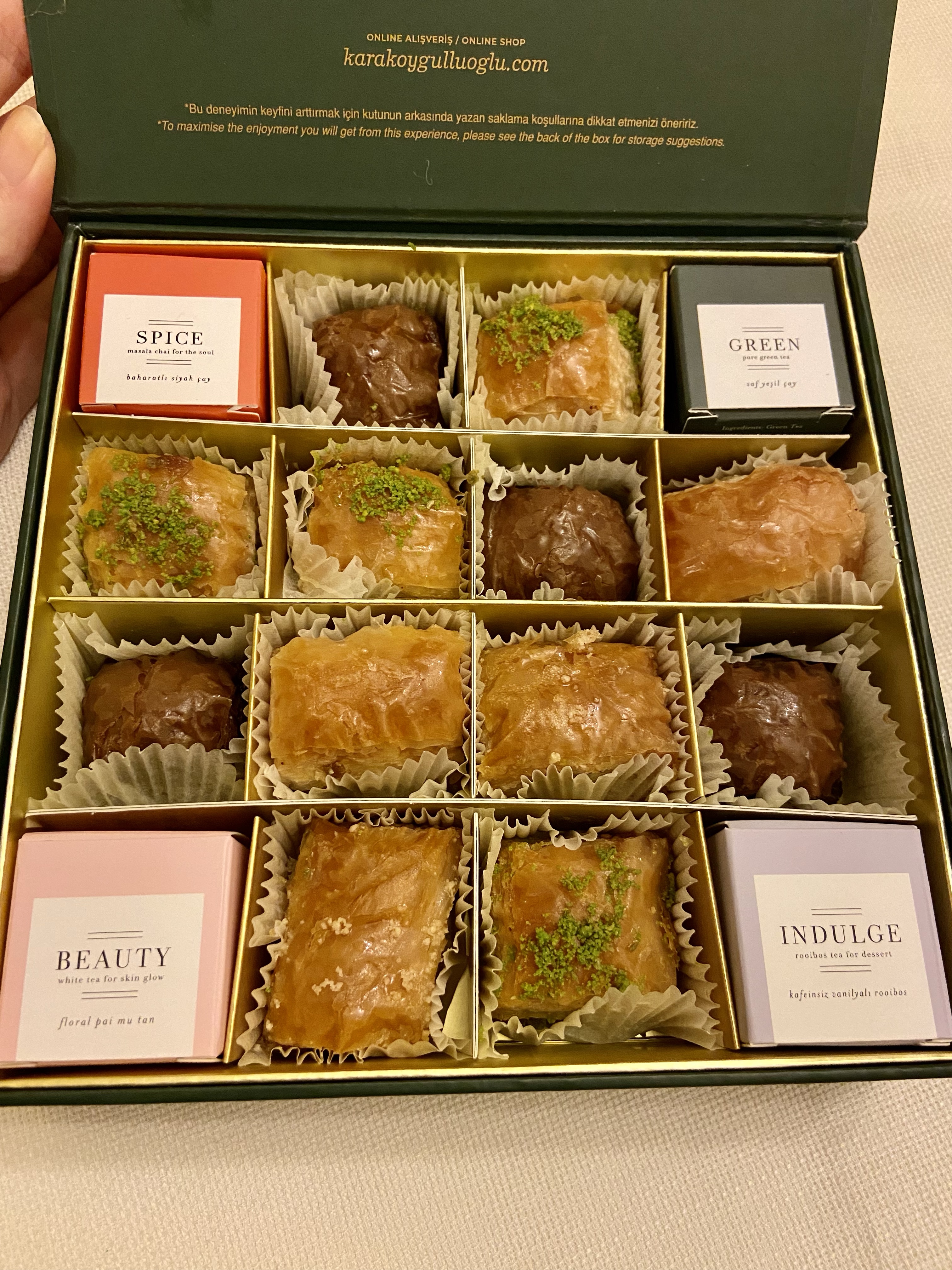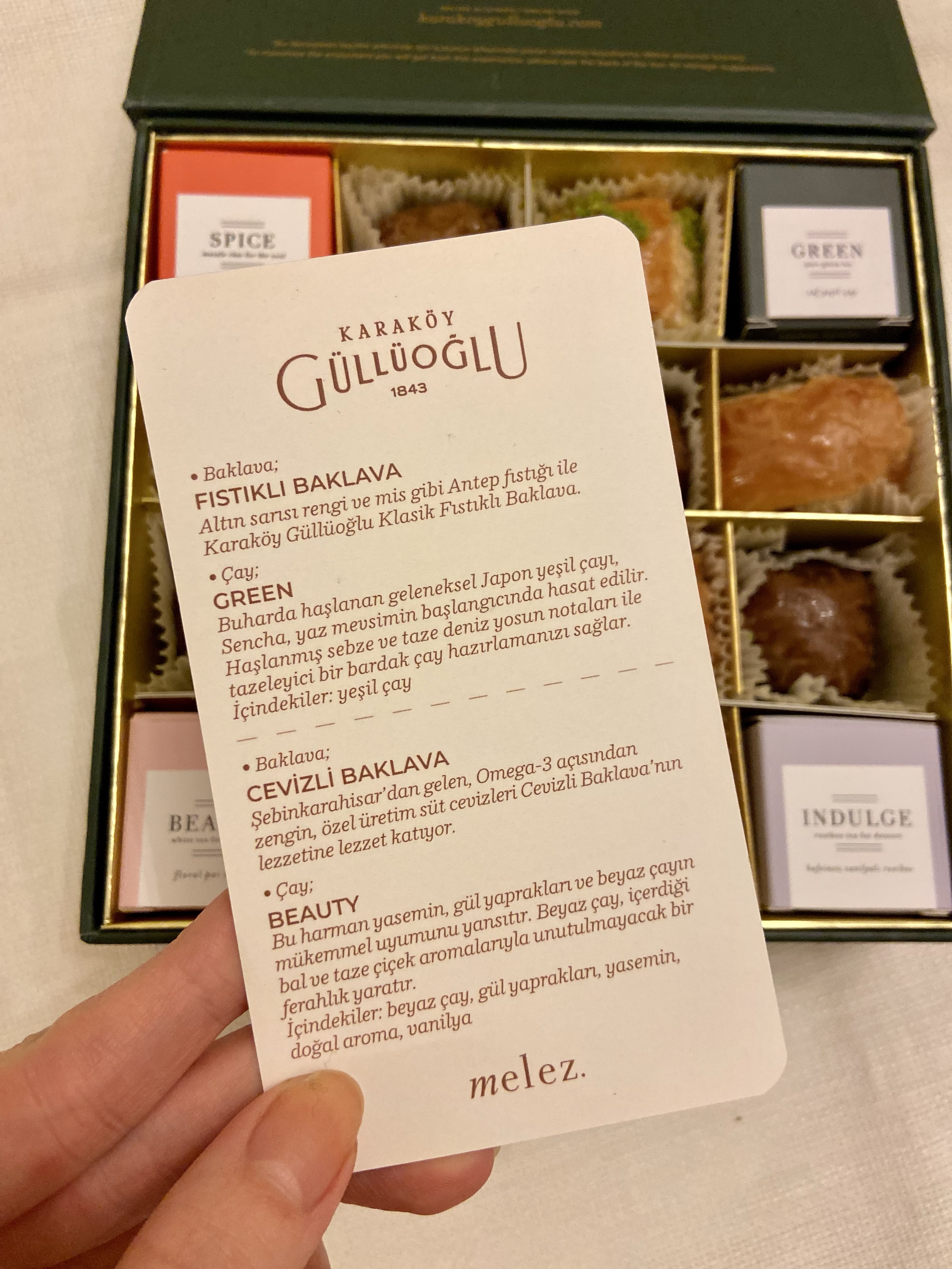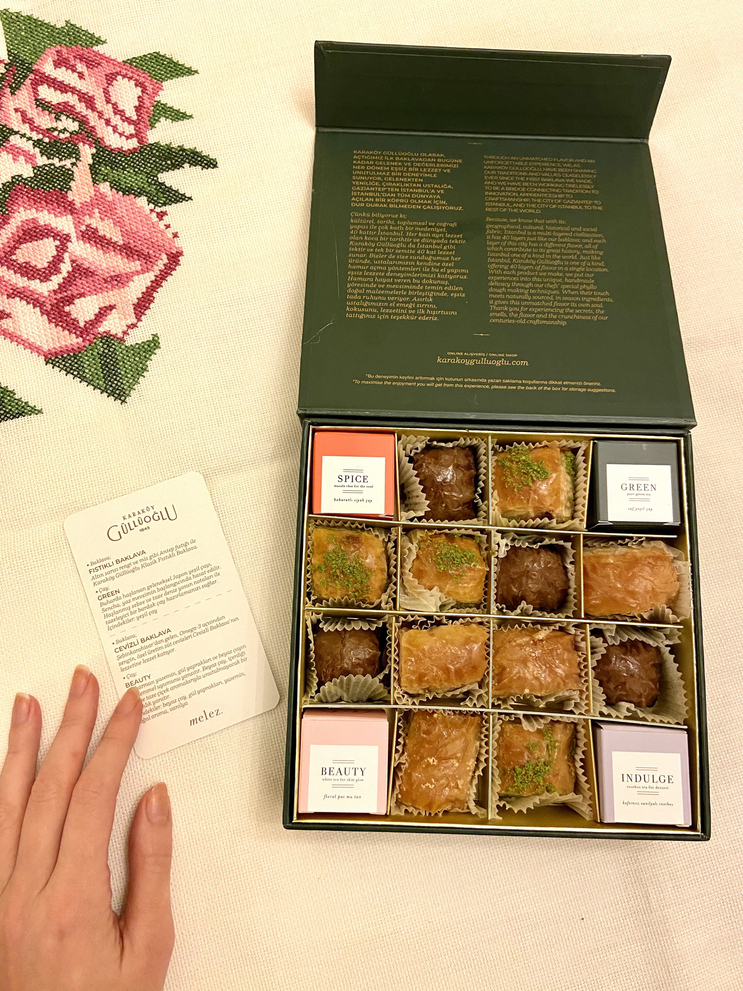 İstanbul’da baklava denince akla ilk gelen marka olan Karaköy Güllüoğlu ise baklavanın yanında çay içilmesi geleneğinden yola çıkıp Melez Tea çaylarıyla bir eşleştirme yapmış ve bir tadım kutusu hazırlamış durumda, bir süredir de Karaköy’deki dükkanlarında satılıyor. Bu işbirliğini ilk gördüğümde çok şaşırdığımı söylemem lazım, zira klasik siyah çay dışındaki çay alternatiflerine yönelindiğinde yerli markalar içinde belki en kalitelisi olan ama çok az bilinen bir marka Melez Tea, zira Chado bu konuda kuyunun başını tutmuş gibi. O açıdan görünce ilgim bir kat daha arttı, çünkü bu “en bilinen”le iş yapalım mantığının dışına çıkıldığını gösteriyor ve benim gibi çay meraklıları için çok önemli bir detay. Kutunun kendisi de ayrıca çok şık, hediyelik olmaya müsait. Ama bence en güzeli, evde müsait bir ortam hazırlayıp hakikaten kendinize -ve belki sevdiğiniz bir iki kişiyle daha- böyle bir tadım deneyimi hediye etmeniz.