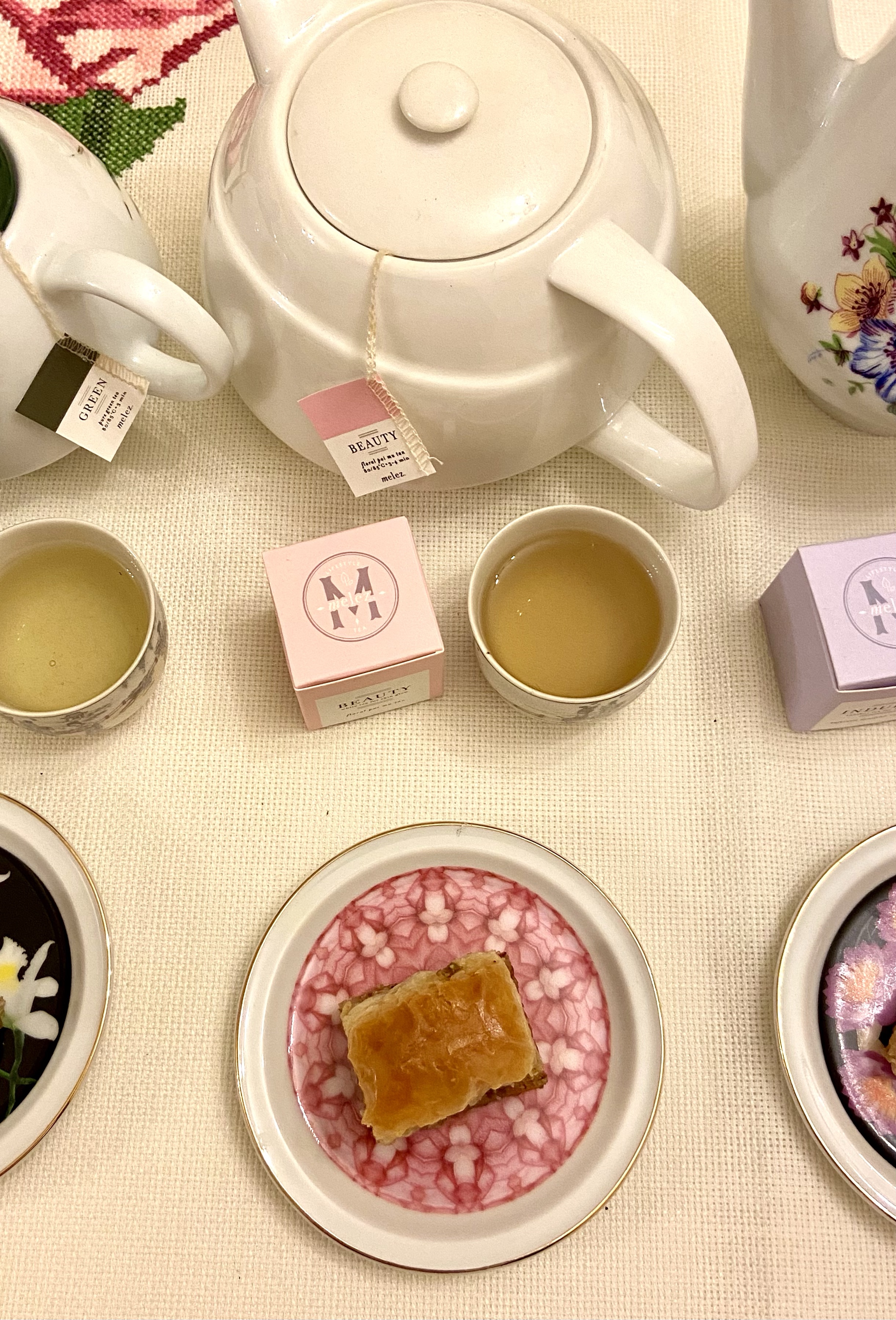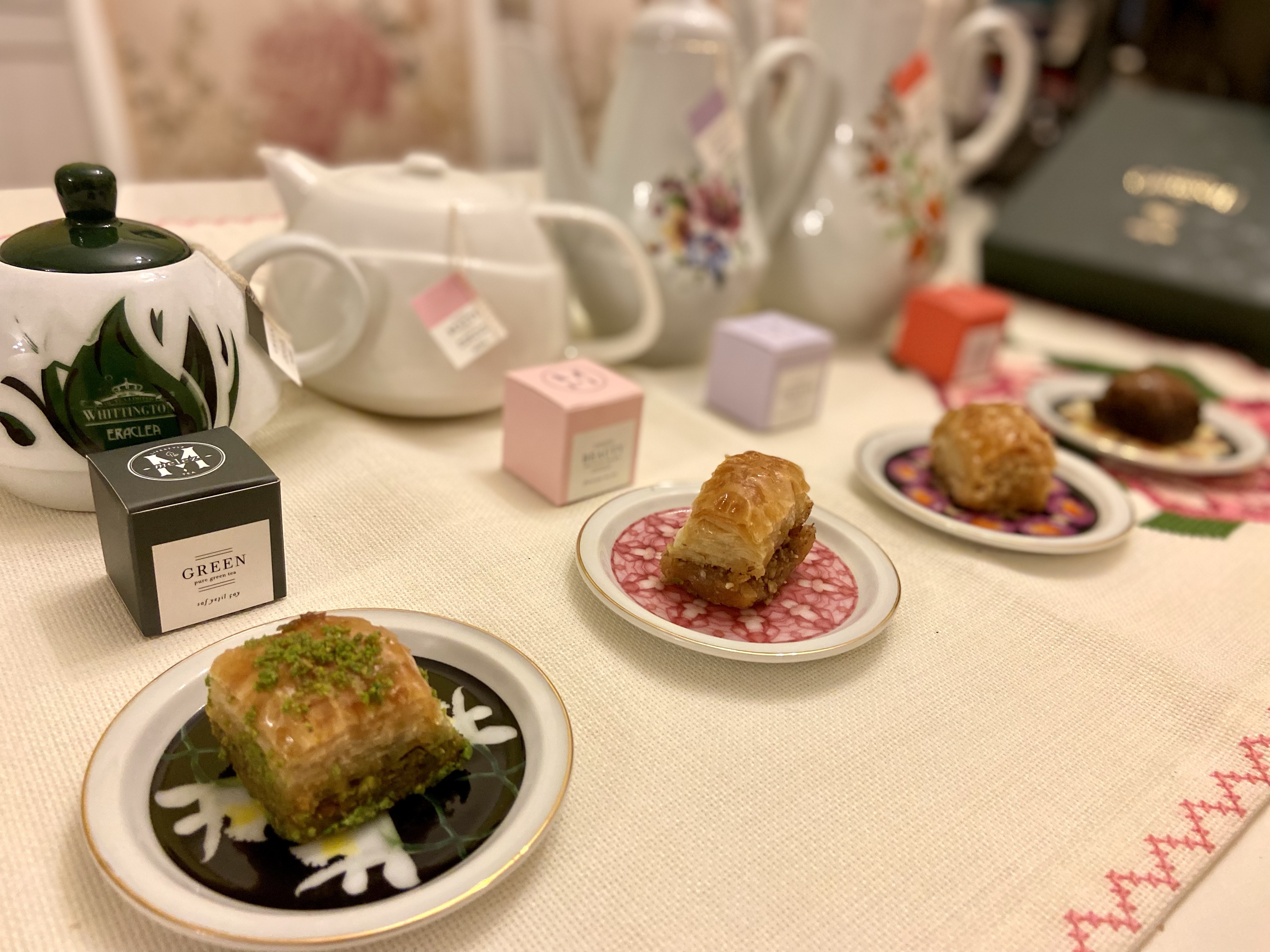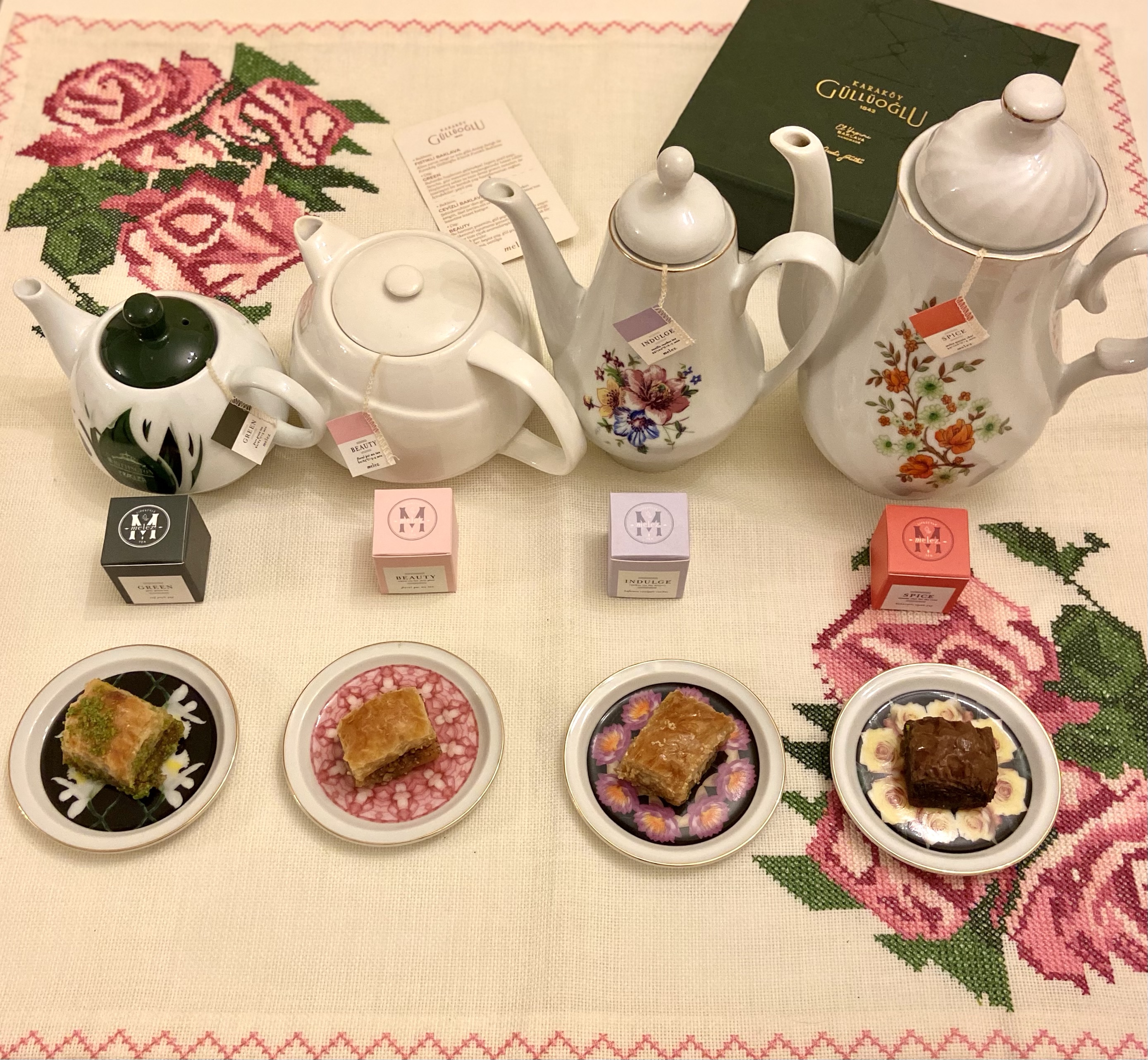 Güllüoğlu seçkisini yansıtan kutumuzda fıstıklı baklavayla eşleşmesi için sade yeşil çay, cevizli baklavayla eşleşmesi için gül ve yasemin yapraklı beyaz çay, fındıklı dolamayla eşleşmesi için kadife çiçekli vanilyalı rooibos ve çikolatalı baklavayla eşleşmesi için masala çayı var. Keyifli bir tadım için önce masayı hazırlayalım: Kaynatıp birazcık soğuttuğunuz, takriben 85-90 derecelerdeki suyu ayrı kaplardaki bez poşetlerin üstüne dökün. Masala çayı demlenmek için biraz zamana ihtiyaç duyacaktır (6-8 dakika), o yüzden onu biraz önceden demleyebilirsiniz, ondan sonra rooibos’a suyu dökün (o da 5-6 dakikaya ihtiyaç duyar), ama hem yeşil çay hem de beyaz çay 2-3 dakika gibi kısa sürede hazır olacağı için onları hazır olduktan sonra demlemekte fayda var. Özellikle yeşil çay diğerlerinden daha fazla su kaldırıyor, örneğin diğerlerine 200-250 ml su koyuyorsanız yeşil çaya 300-350 ml koyabilirsiniz bence. Ben evdeki tüm porselen demlikleri bu işle görevlendirdim, sıra sıra dizdim. (Hatta farkında olmadan etiketlerin rengine göre demlik kullanmışım, gerçekten sonradan aydım buna! Ailemdeki disiplinsever kanat, mutlu musunuz!) Porselen veya cam demlik kullanılması her zaman tercih sebebidir, metalden kaçınmanızı öneririm. (Bu arada sağdaki iki çiçekli demlik anneannemden kalma, çok şeker değiller mi?) Demlenme süresi, tadım sırası gibi tüm detayları gözettiyseniz, geçişlerde ağız tadınızı nispeten nötrlemek için suyunuzu da hazır ettiyseniz artık tadıma geçebiliriz.