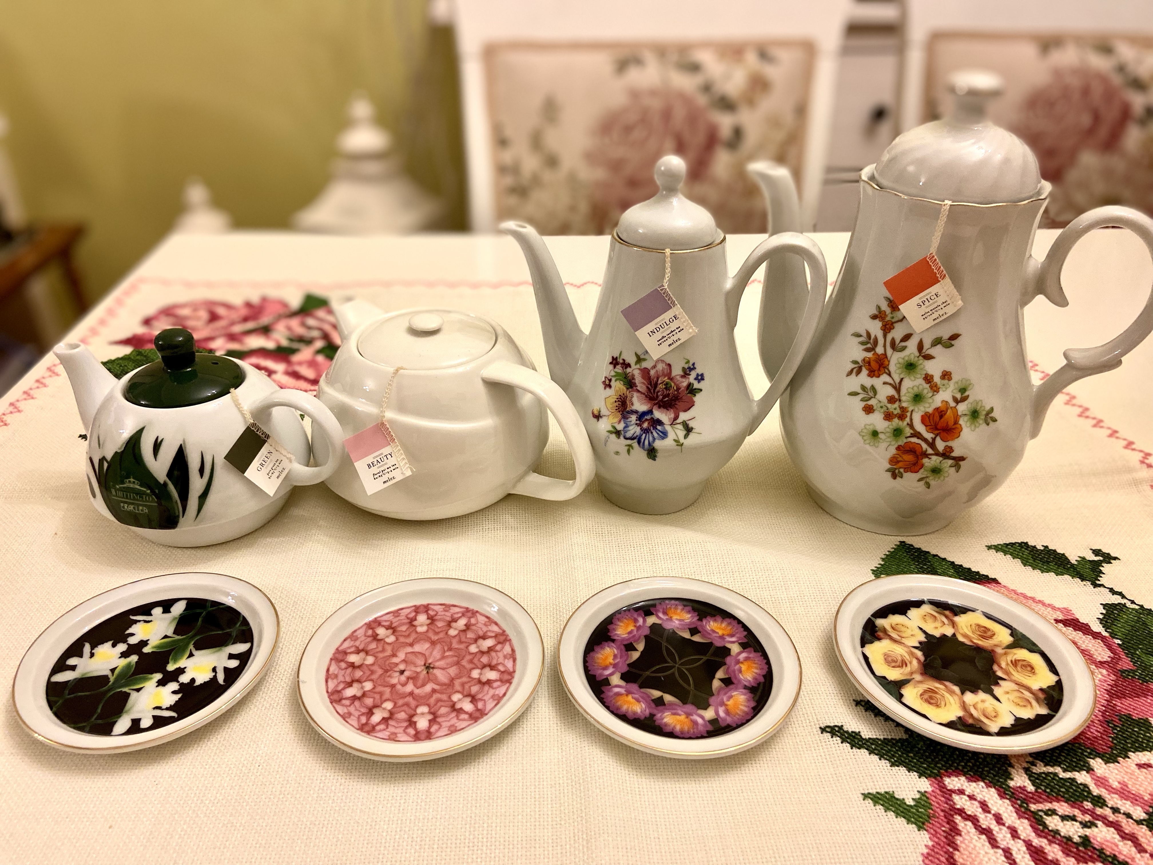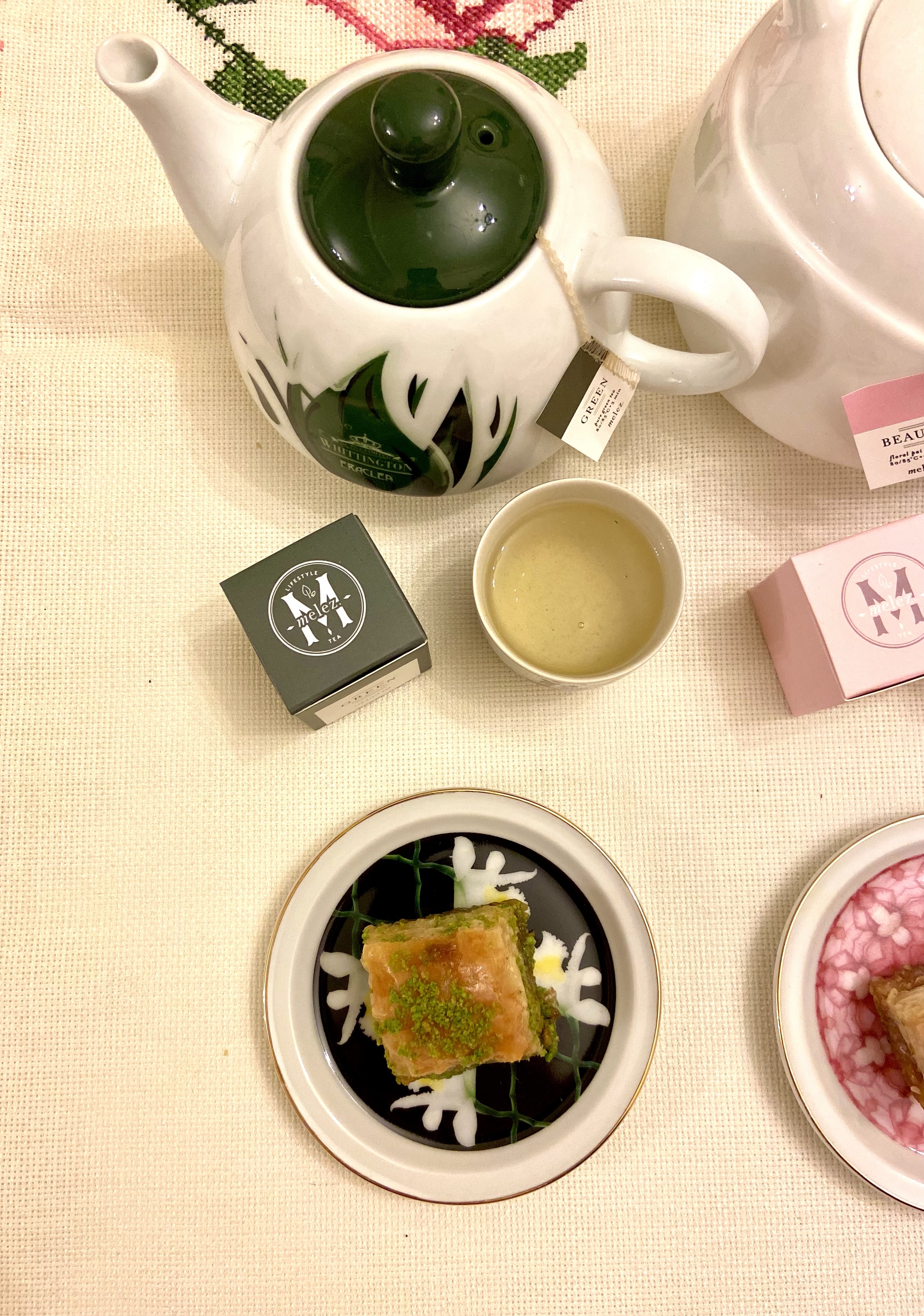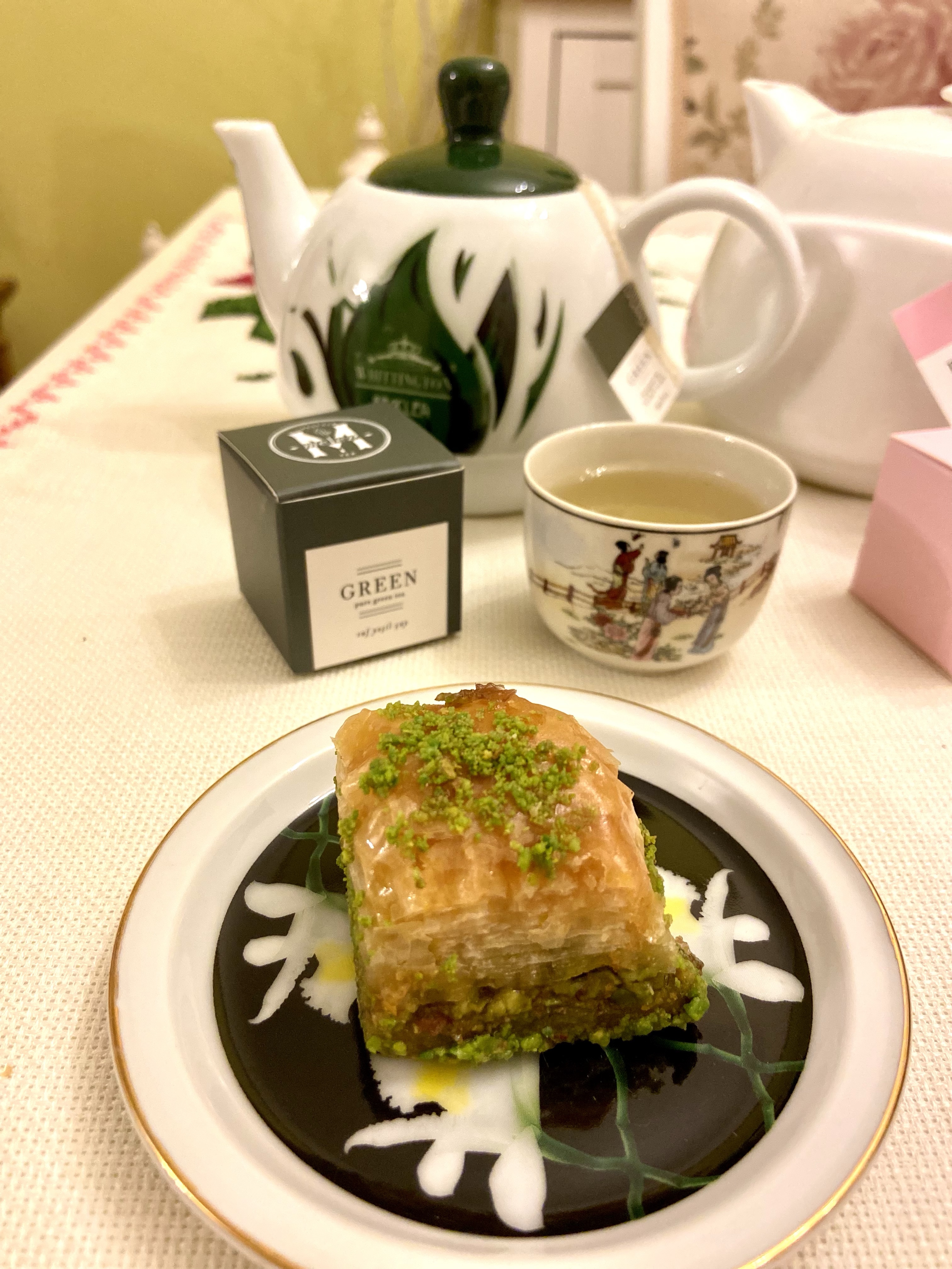 Güllüoğlu seçkisini yansıtan kutumuzda fıstıklı baklavayla eşleşmesi için sade yeşil çay, cevizli baklavayla eşleşmesi için gül ve yasemin yapraklı beyaz çay, fındıklı dolamayla eşleşmesi için kadife çiçekli vanilyalı rooibos ve çikolatalı baklavayla eşleşmesi için masala çayı var. Keyifli bir tadım için önce masayı hazırlayalım: Kaynatıp birazcık soğuttuğunuz, takriben 85-90 derecelerdeki suyu ayrı kaplardaki bez poşetlerin üstüne dökün. Masala çayı demlenmek için biraz zamana ihtiyaç duyacaktır (6-8 dakika), o yüzden onu biraz önceden demleyebilirsiniz, ondan sonra rooibos’a suyu dökün (o da 5-6 dakikaya ihtiyaç duyar), ama hem yeşil çay hem de beyaz çay 2-3 dakika gibi kısa sürede hazır olacağı için onları hazır olduktan sonra demlemekte fayda var. Özellikle yeşil çay diğerlerinden daha fazla su kaldırıyor, örneğin diğerlerine 200-250 ml su koyuyorsanız yeşil çaya 300-350 ml koyabilirsiniz bence. Ben evdeki tüm porselen demlikleri bu işle görevlendirdim, sıra sıra dizdim. (Hatta farkında olmadan etiketlerin rengine göre demlik kullanmışım, gerçekten sonradan aydım buna! Ailemdeki disiplinsever kanat, mutlu musunuz!) Porselen veya cam demlik kullanılması her zaman tercih sebebidir, metalden kaçınmanızı öneririm. (Bu arada sağdaki iki çiçekli demlik anneannemden kalma, çok şeker değiller mi?) Demlenme süresi, tadım sırası gibi tüm detayları gözettiyseniz, geçişlerde ağız tadınızı nispeten nötrlemek için suyunuzu da hazır ettiyseniz artık tadıma geçebiliriz.