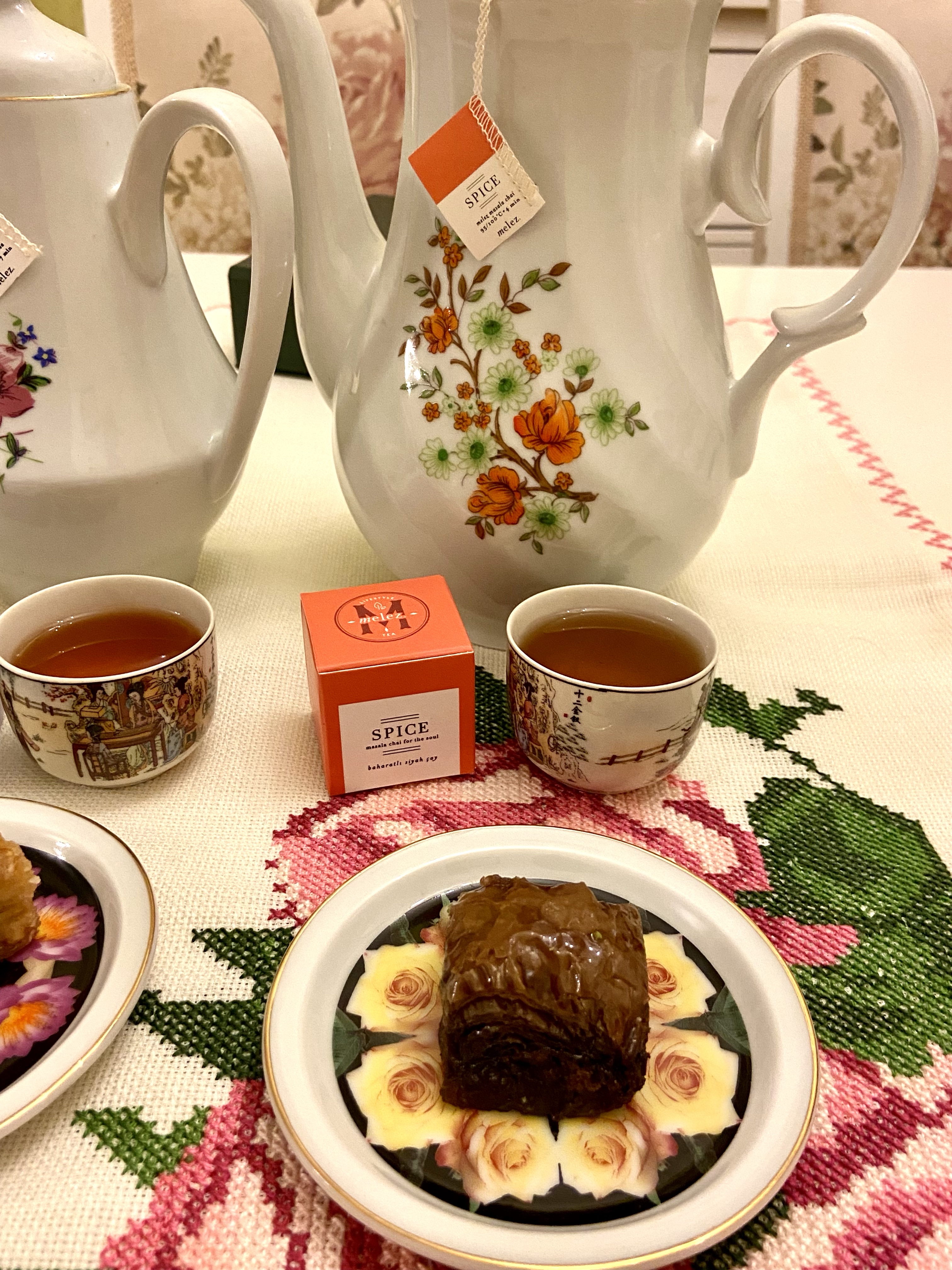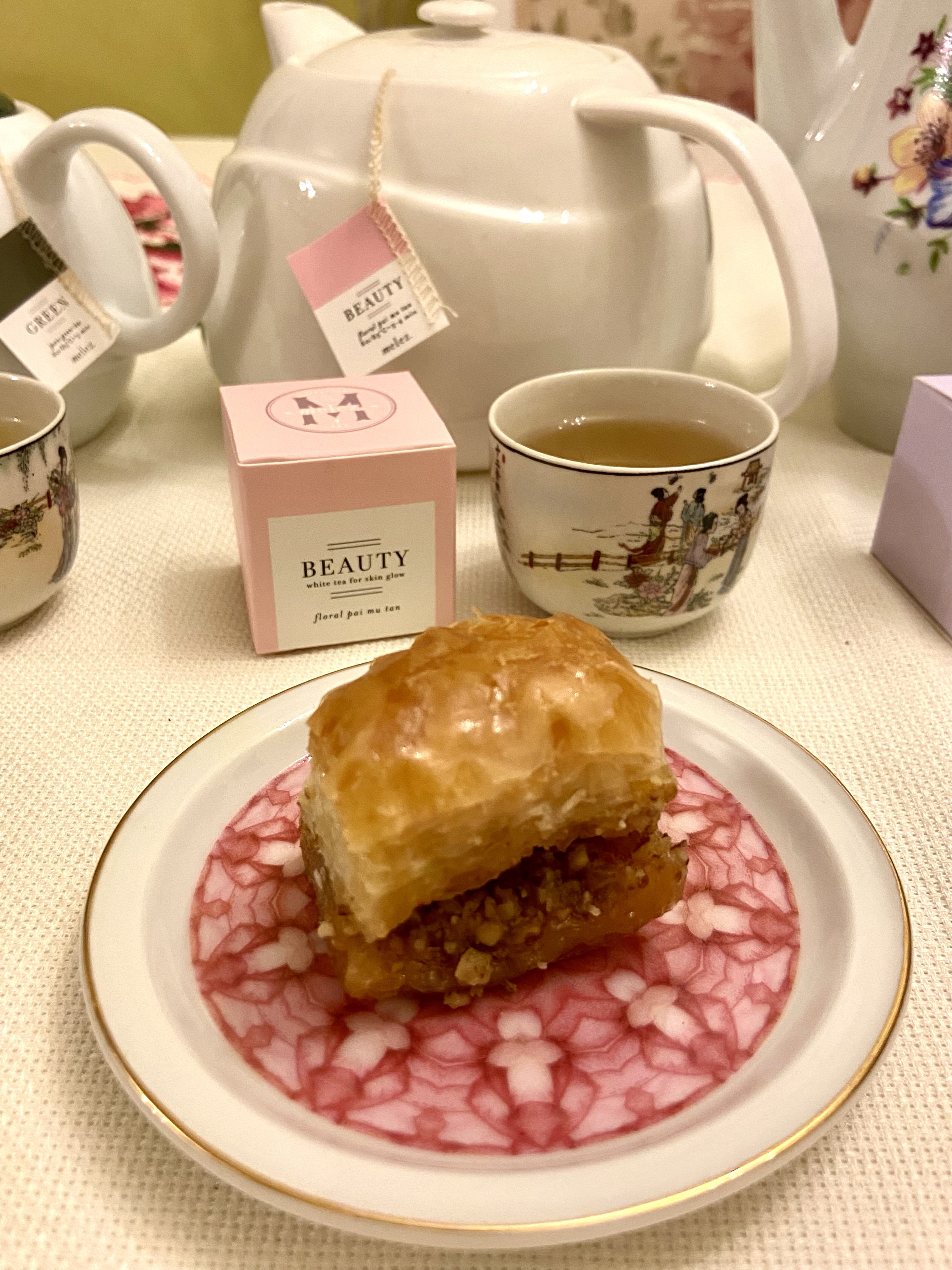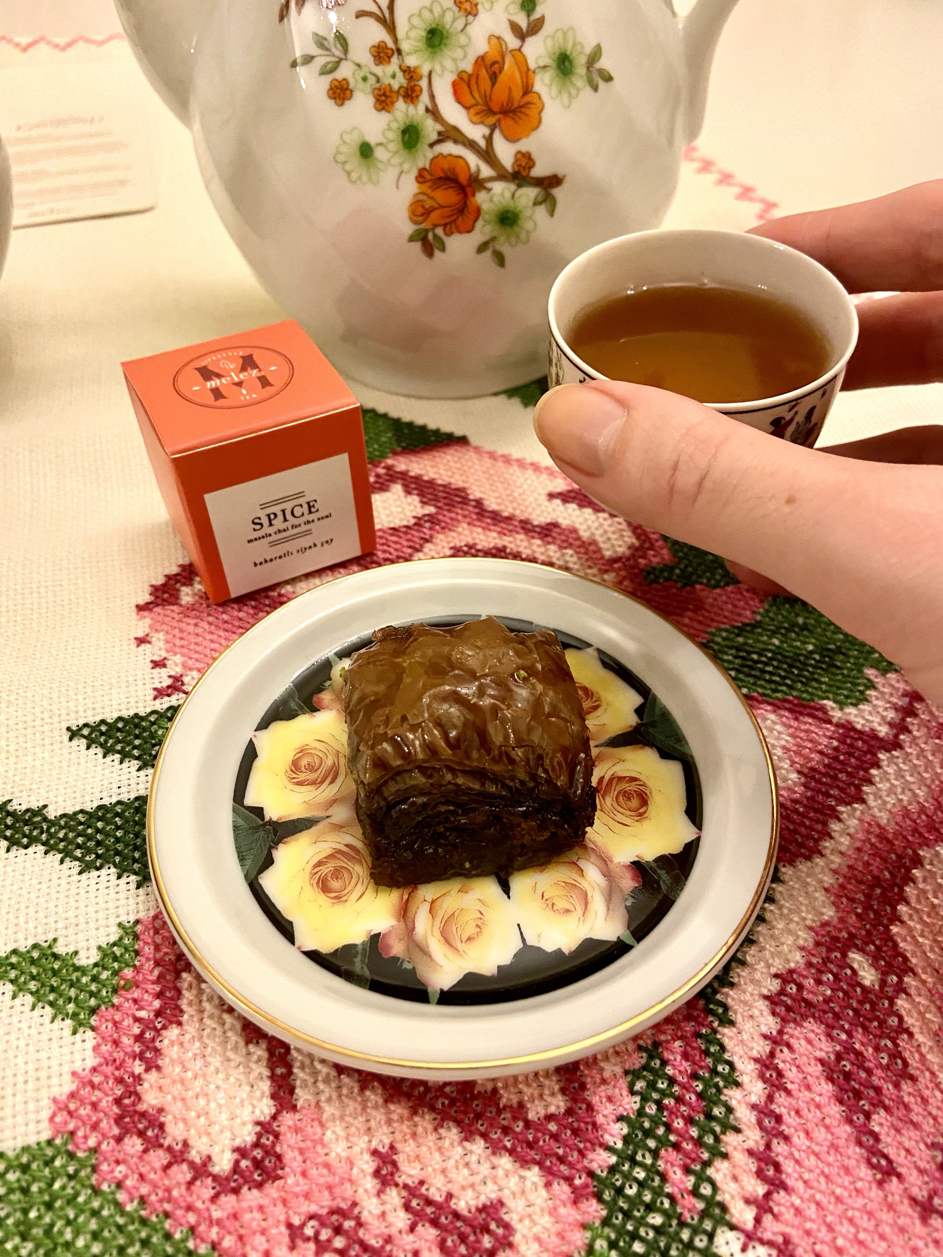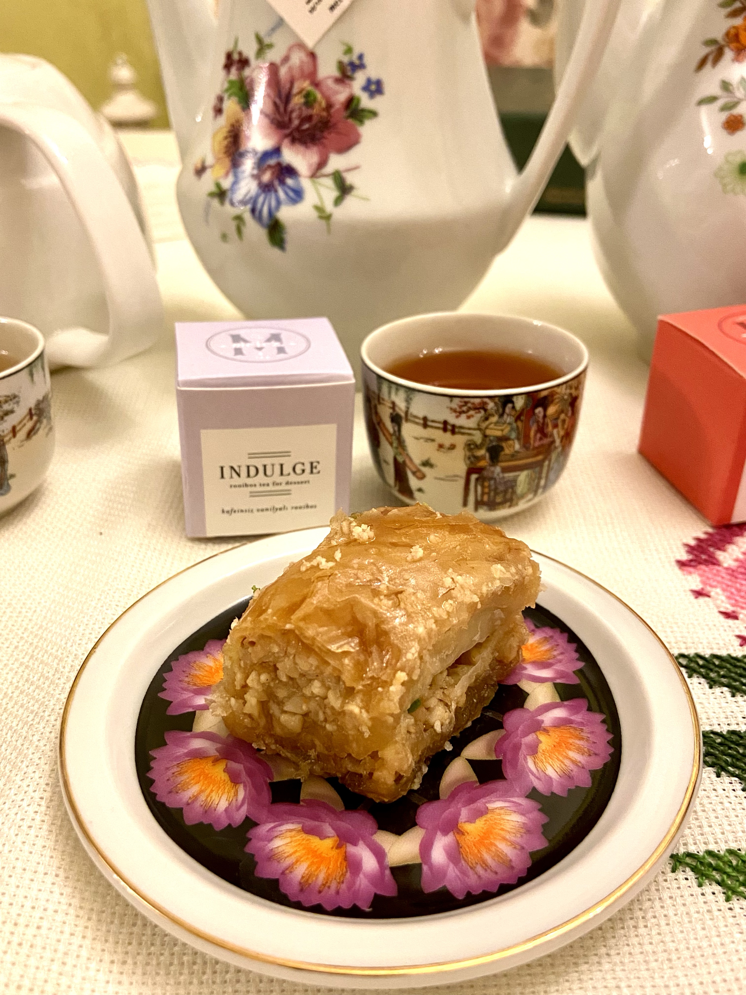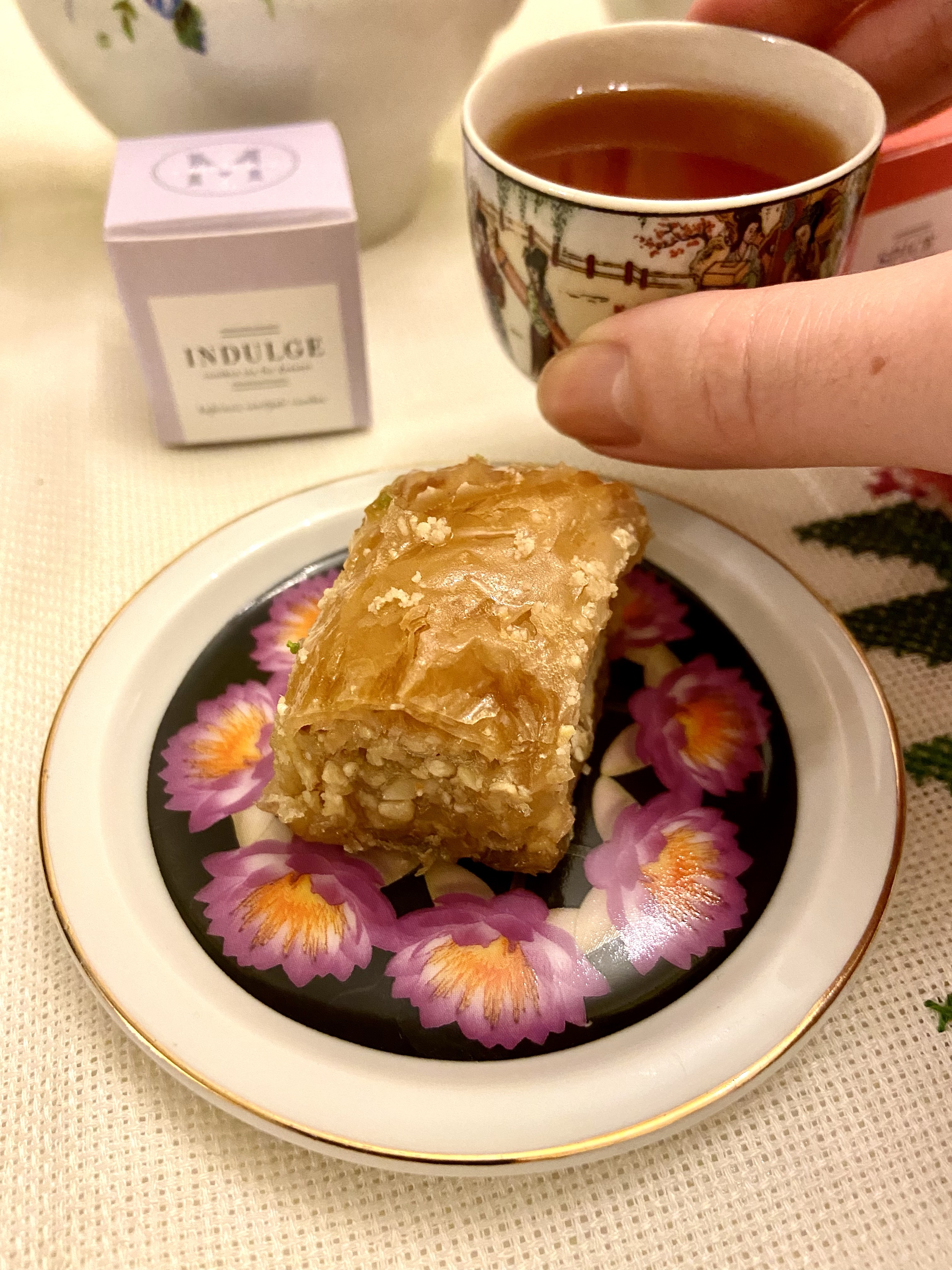 Üçüncü eşleşme, fındıklı dolama ile eşleşen rooibos. Rooibos teknik olarak bir “çay” değil, çünkü camellia sinensis bitkisi değil, ayrı bir bitki. Afrika’nın çayı olarak düşünülebilen bu bitki, “Indulge” isimli Melez Tea harmanında vanilya ve kadifeçiçeği yapraklarıyla birleştirilmiş. (Burada küçük bir sorun var, kutuda içerik kısmına İngilizcesine marigold, Türkçesine ise nergis çiçeği yazılmış ancak kadife çiçeğinin çayda kullanımı oldukça yaygınken nergis neredeyse hiç kullanılmaz. O yüzden kadife çiçeği/marigold olduğunu varsayıyorum, ki tadı da o yöndeydi.) Rooibos benim çok hoşlandığım bir bitki değil, tadını fazla odunsu buluyorum, ki bu harmandaki aromalar da bunu örtecek kadar yoğun değildi. O yüzden dört “çay” içinde en az beğendiğimin bu olması normal. Baklavaya gelirsek, fındıklı dolama bence çok leziz. Fındıkların dişe gelir dokusu ile üst kattaki çıtır ama klasik baklavaya göre daha güçlü yufka dokusu mükemmel uyumlu. Nedense fıstıklı baklava dışındaki (cevizli, fındıklı, bademli vs.) baklavalarda sanki “ucuza kaçıldığı için” fıstık dışında kuruyemişler kullanılmış gibi bir his ve algı var, ama bence bu çok yanlış, çünkü bizi kısır bir anlayışa doğru itiyor, tabii ki türlü türlü yemiş de denenmeli, bakın favorisi fıstıklı baklava olan biri olarak söylüyorum bunu! Sarayda elmalı, vişneli, portakallı, kavunlu baklavalar yapılmış, biz fındıklı baklava mı yapıp yemeyeceğiz yani?