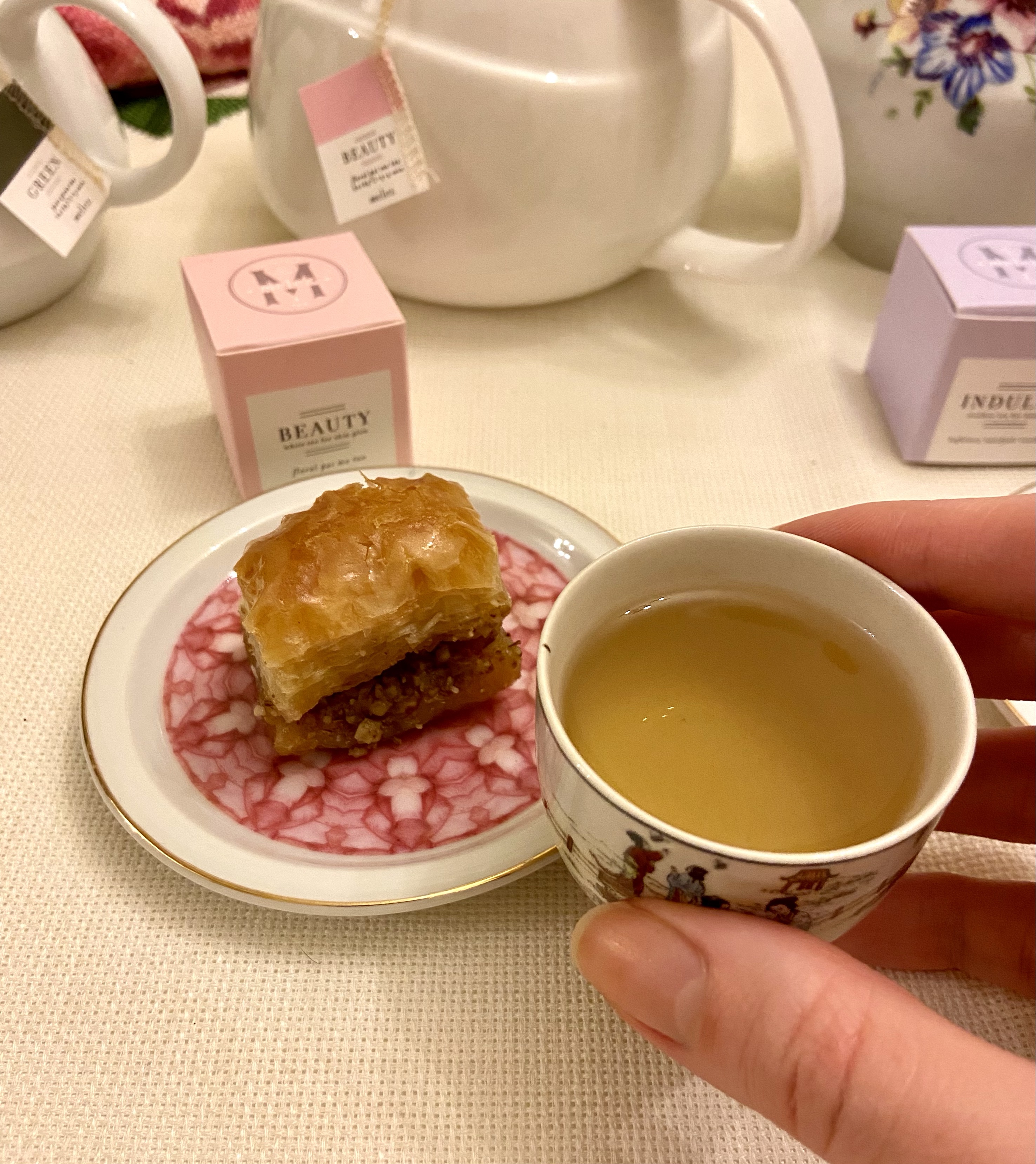 Kutuda neler olduğuna gelince… 4 ayrı çayla eşleştirilmesi için 4 farklı baklava (hepsinden üçer adet) sunuluyor kutuda. Yani bir kutuyla evde üç kişilik tadım etkinliği düzenlemek mümkün. Biz iki kişi denedik, ama çaylar tadım için rahatlıkla dört kişiye bile yeter, zira her kaliteli çay markasında olduğu gibi, Melez Tea’nin de bir bez poşetiyle (tela değil, bez) en az 300 ml güzel çay demlemek mümkün (hatta çeşide göre bu miktar artabilir bile!).