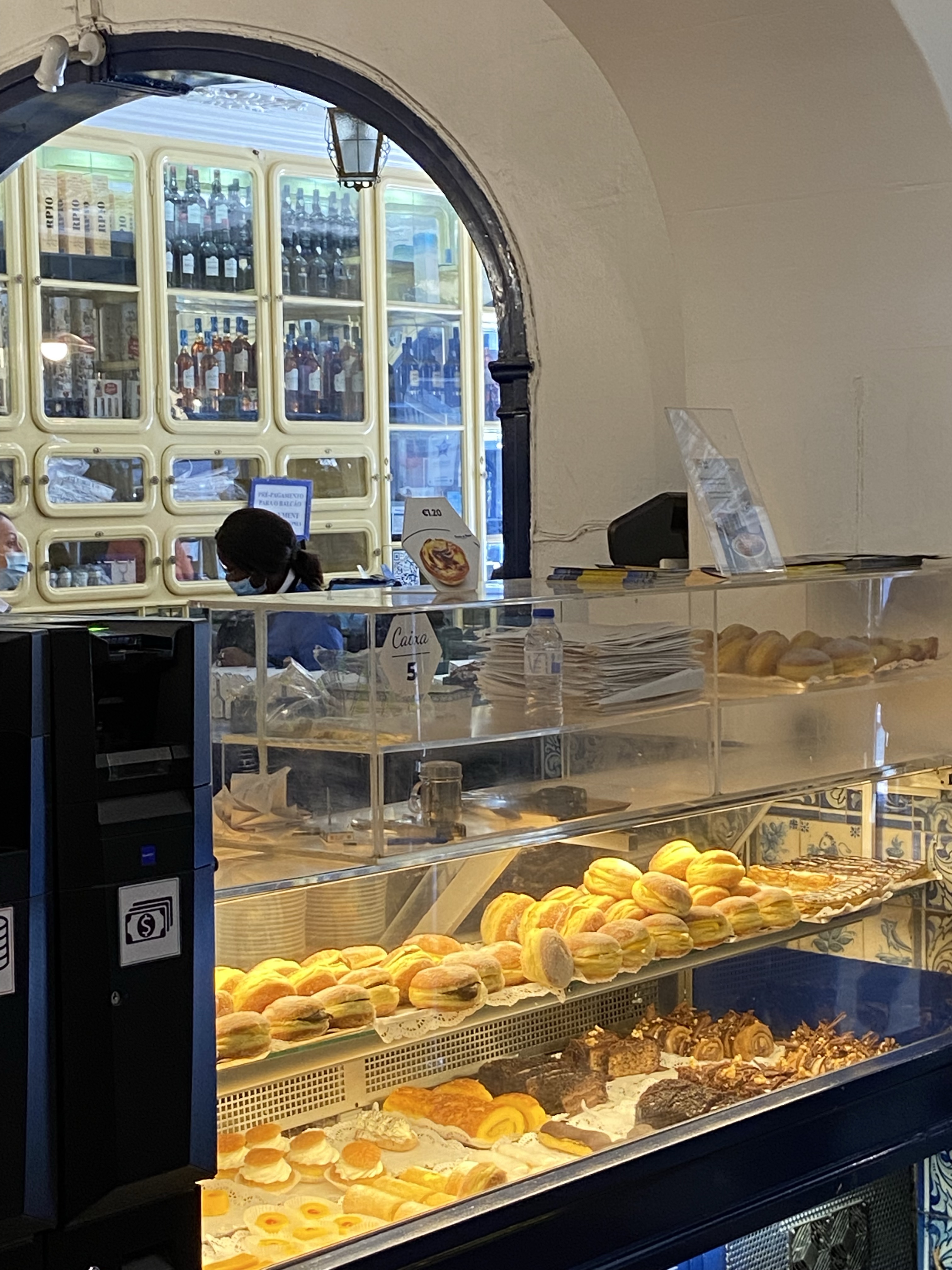 Portekiz’de hemen her kafede, pastanede olduğu gibi burada da bira, şarap, Porto şarabı, vişne likörü gibi alkollü içkiler var. Tam da bu yüzden burayı sadece kahvaltı ve tatlı molası için denemenin ötesine geçebilirsiniz, zira geçmezseniz yazık! Mekanın öyle güzel bir havası var ki, doğrusu benim iki kez oturduğuma çok memnun olduğum bir yer oldu. Mavi çiniler, dışarıdan belli etmese de içeride acayip geniş ve dolambaçlı ilerleyen salonlar, güneşle yıkanan kocaman pencereler… Masa için sıra beklemek istemezseniz ön kapıdan da alabilirsiniz alacaklarınızı, ama bence vakit ayırıp oturmak gerek, masa sayısı çok olduğu için sıra çabucak ilerliyor.