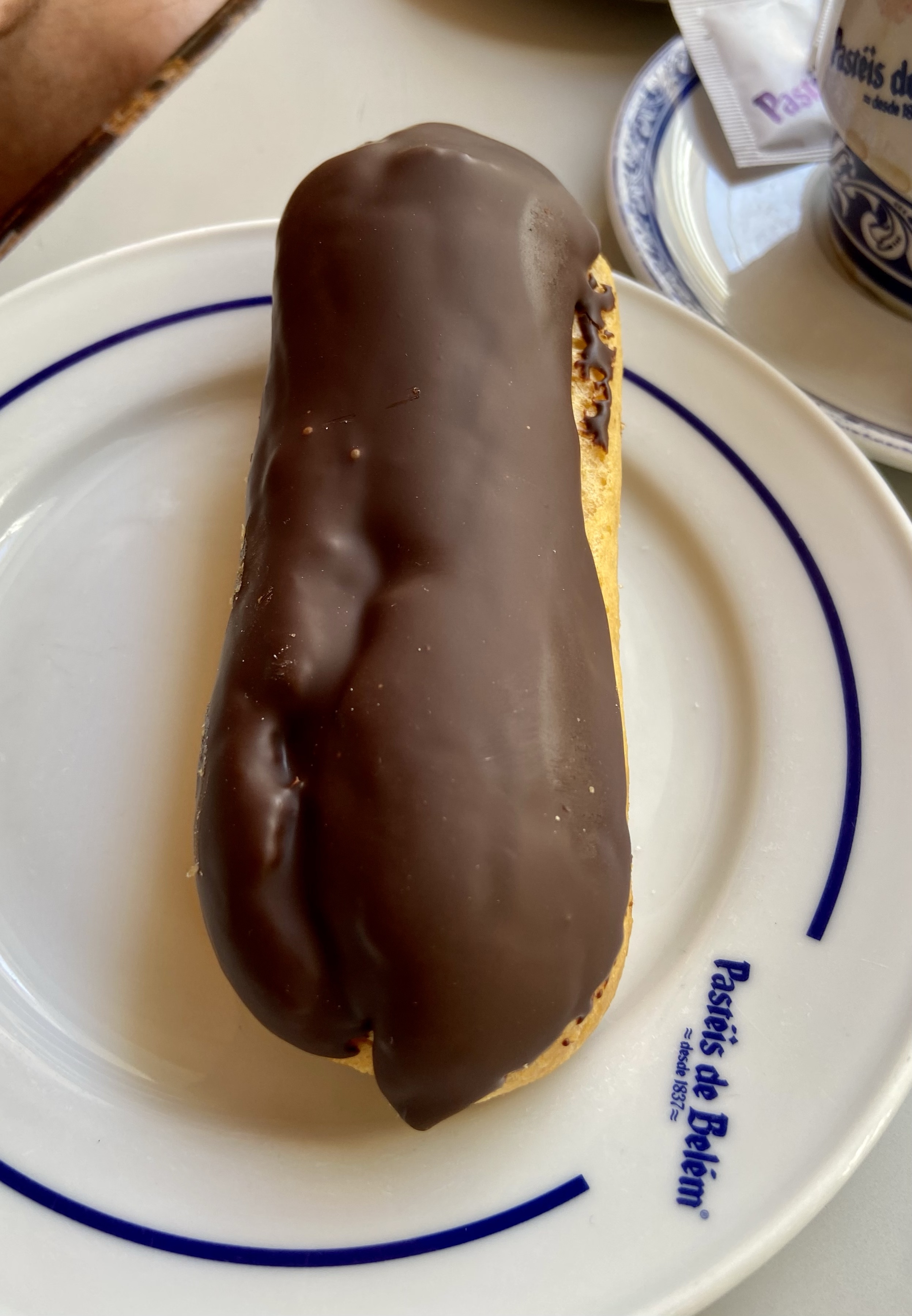 Şimdi gelelim tatlılara… Portekiz’deki birçok tatlı bir şekilde yumurtalı muhallebi veya onun daha koyu kıvamlı versiyonu yumurta custard içeriyor, yani çikolata ya da limon dolgulu geleneksel tatlı yok gibi bir şey. Tıpkı nata’lar gibi, Alman pastası hamurunu andıran bola de Berlim yahut milföy tatlıları da genelde yumurtalı kremayla doldurulmuş. Her şey bunun etrafında dönen çeşitlemeler ve özünde birbirlerinden doku olarak ayrışsalar da tat olarak çok farklı değiller. Bunun dışında, un yerine yumurta ağırlıklı pandispanyalara benzetilebilecek bir takım turta benzeri tatlılar var. Ben o kadar “yumurta insanı” olmadığım için bu tatlılar benim için çok anlamlı değil (şekerli omleti andırıyorlar zira), ama sevenler deneyebilir. Bu yumurta turtalarının portakallısı, bazen de limonlusu bulunuyor pastanelerde. Pasteis de Belem’de de portakallısı mevcut. Lezzetli, ama bahsettiğim şekerli omlet hissi yüzünden ben ondan ancak bir iki çatal aldım (zaten Alp kendine söylemişti). Burada esas çok hoşuma giden şeyse ekler oldu, normalde beyaz dolgulu ekler severim ama buradaki siyah dolgulu; fakat öyle güzel bir çikolata tadı geliyor, üstündeki çikolata kaplaması da öyle tatmin edici ki çok çok iyi buldum. Bence nata’lar, turtalar denerken araya bir de ekler sıkıştırın muhakkak. (Bir de beyaz çikolata kaplamalı ve beyaz dolgulu eklerleri var, ancak kalmadığı için onu deneyemedim.)