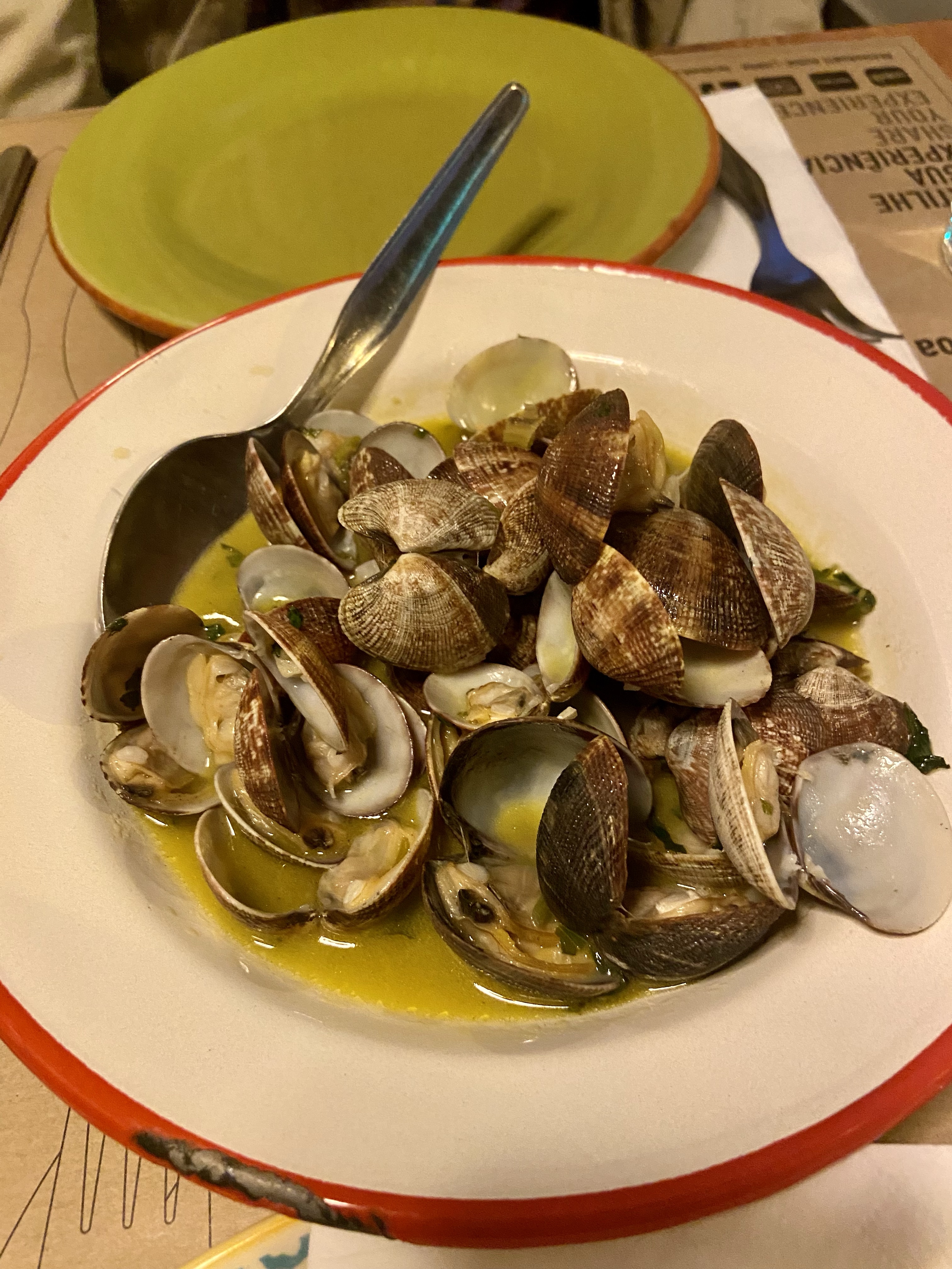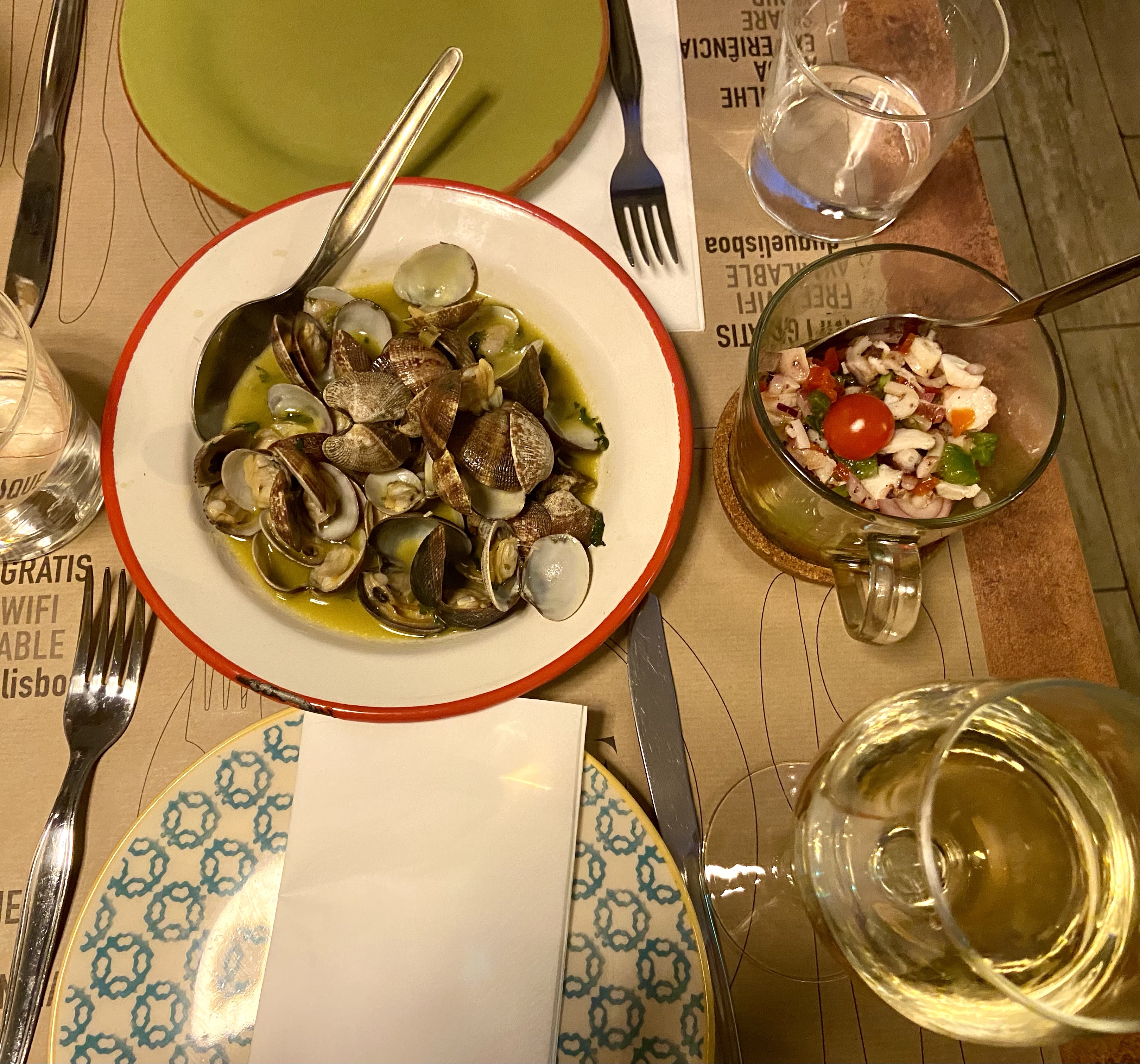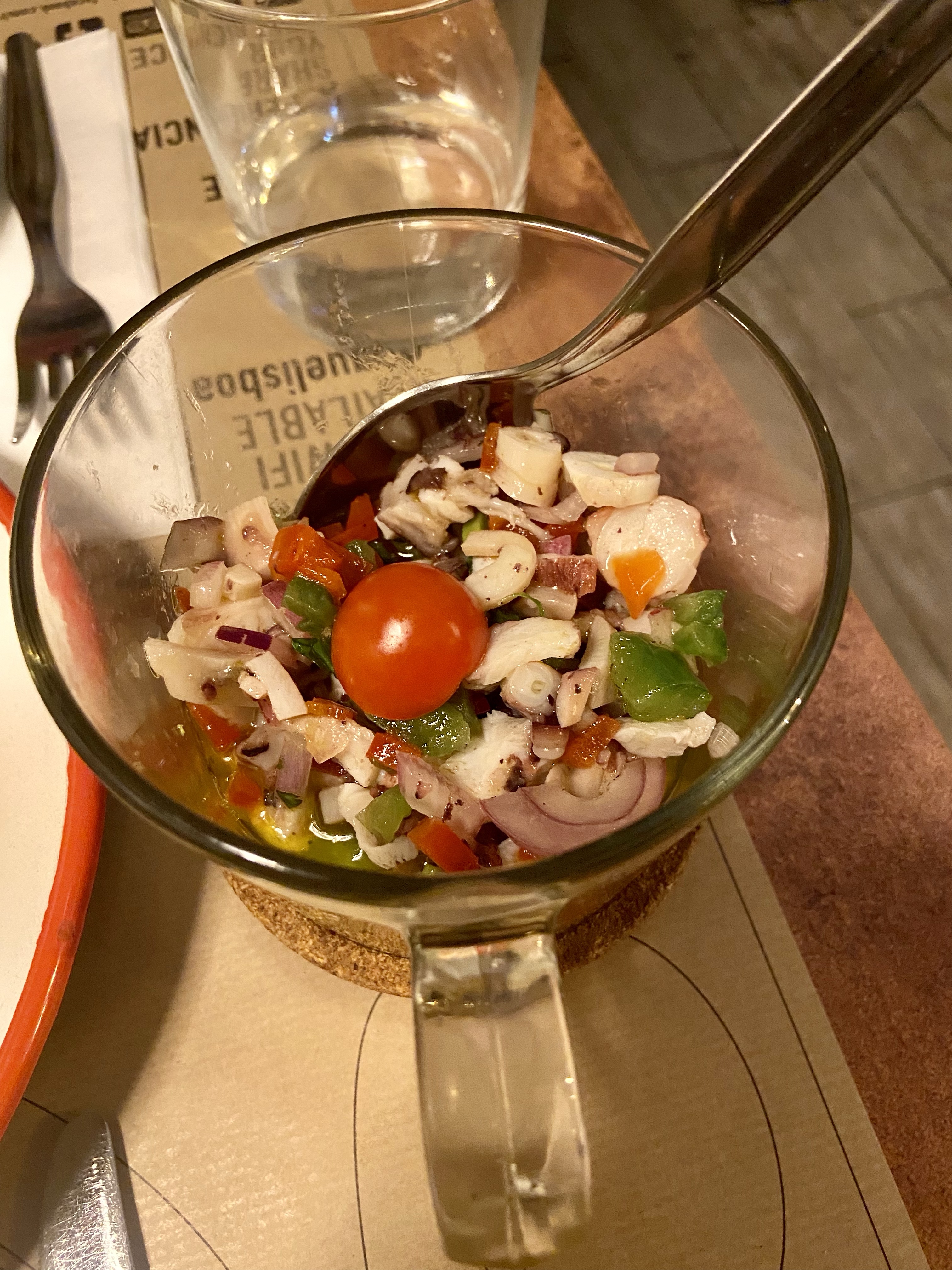 Peynir, zeytin ve tereyağla atıştırmaya başladıktan sonra, Bairro de Avillez’de çok beğendiğim, o tipik soslu “Bulhao Pato” midyelerden burada da görünce ilk iş onlardan sipariş verdim. Yine nefis, yine o kişnişli, sarımsaklı, beyaz şaraplı sos beni benden aldı. Zaten Portekiz’de en sıradan deniz mahsulü bile üzmüyor da, bu hakikaten çok iyi! Sonra baktım bir ahtapot salatası varmış, içeriğini okuyunca ceviche’ye benzettim, ceviche de çok sevdiğim için onu da seveceğimi tahmin ettim. Ama doğrusu ilkini bitirdiğimde ikincisini söyleyecek kadar seveceğimi düşünmemiştim!