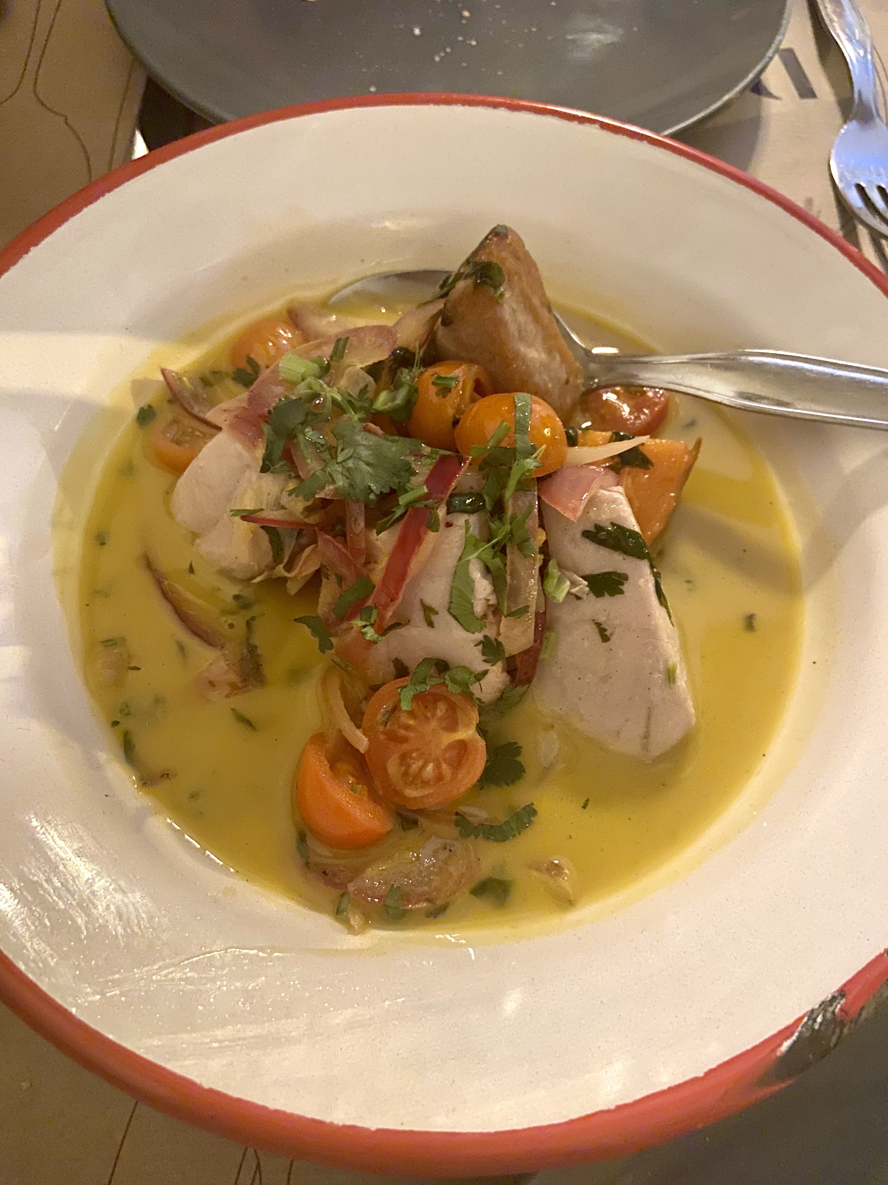 Gelelim diğer sıcaklara… Biberiye, narenciye ve sarımsakla sotelenmiş dev karidesler nefis. Porsiyonda 5 ya da 6 taneydi, kocaman oldukları için gayet doyurucu (önce göz doyacak tabii!) ve hakikaten çok lezzetli. Sahanın dibindeki soslara bandıra bandıra yemekten ben doğrusu çok keyif aldım. Esas sıradışı olansa taze ton balığı yahnisiydi. Ton balığı, yani konserve olmayanı, benim cidden bayıldığım bir balık türü (yellow fin ve blue fin olarak iki türünün ikisi de bence nefis) ancak Türkiye’de maalesef nadiren biftek gibi kesilip pişirilmiş taze ton balığına ulaşabiliyoruz. Portekiz, mevzu denizden çıkanlar olunca her konuda olduğu gibi bu konuda da iyiydi, olağanüstü bir ton balığı yedik burada. Karamelize soğan ve tatlı patates eşliğinde nefis bir suyun içinde braise edilerek pişirilen 4-5 parça ton balığı, yediğim en güzel balık yemeklerinden biriydi.