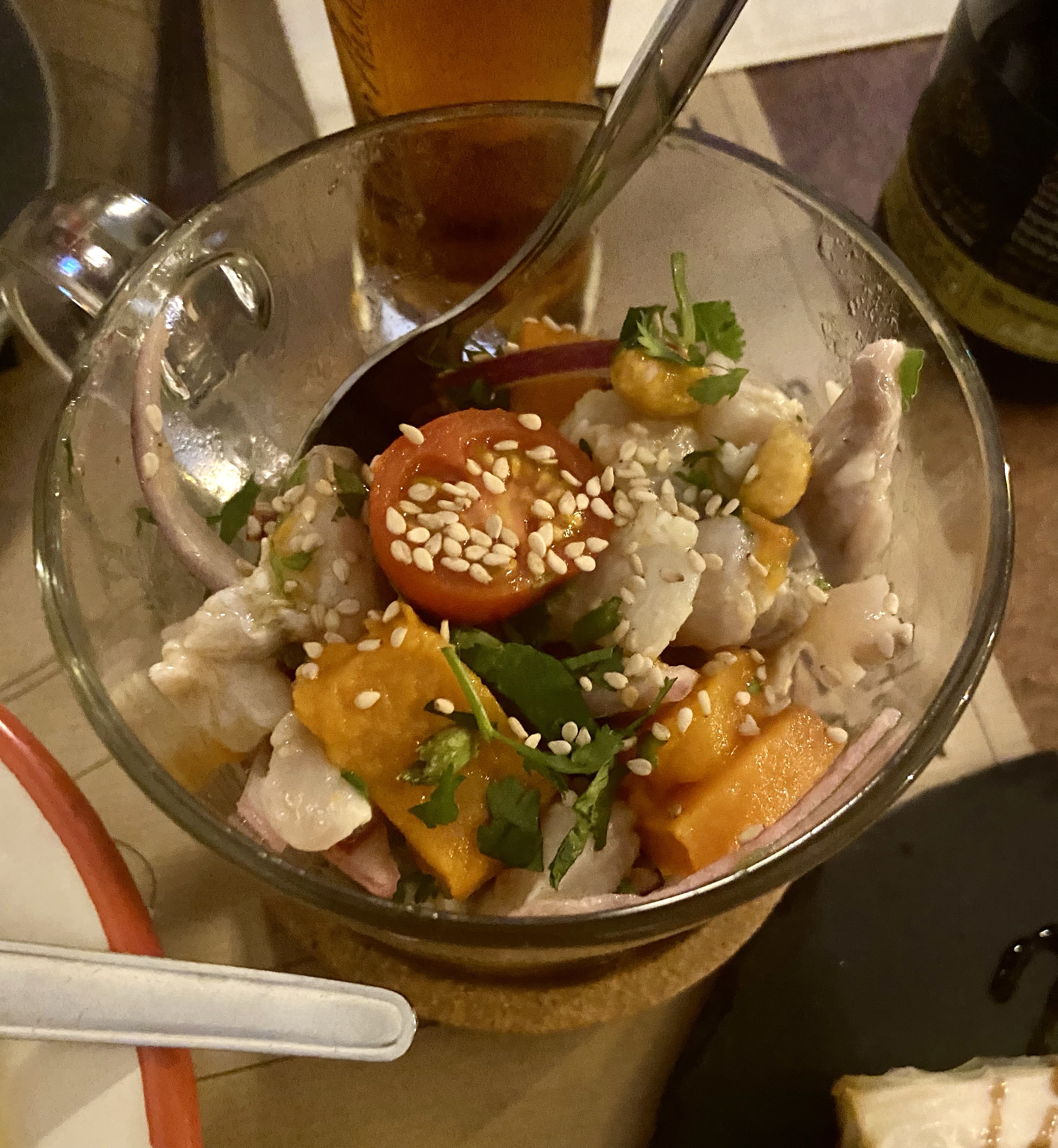E ahtapot salatasını denemişken cevicheyi denememek olmazdı tabii, onu da denedik. Beyaz, sıkı etli bir balık türü kullanılmış olan ceviche de çok lezzetliydi ama doğrusu ikisinden birini seçmek gerekirse ahtapotu tercih etmek gerek. Ve menüde tercih etmemeniz gereken tek kalemi söyleyeyim: Keçi peynirli börek! Tadı kötü müydü? Hayır, gayet güzeldi. Ama biz birkaç tane börek beklerken tek bir tane geldi (düşündükçe yüz ifademize gülüyorum!) Ahtapot salatasının 7,5 Euro olduğu yerde tek bir sigara böreğine de 7,5 Euro fiyat verilir mi? Bence hayır!