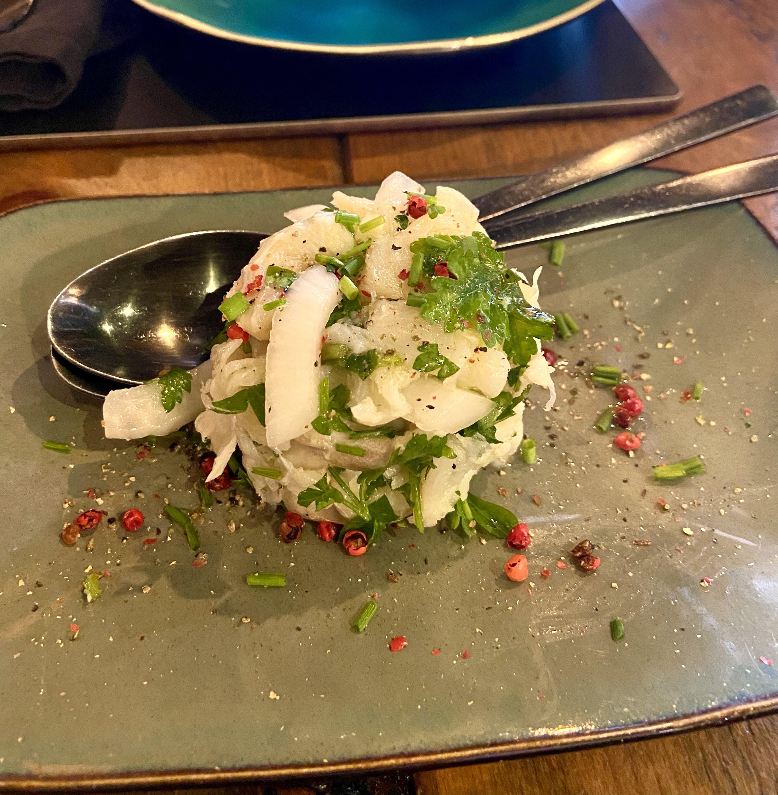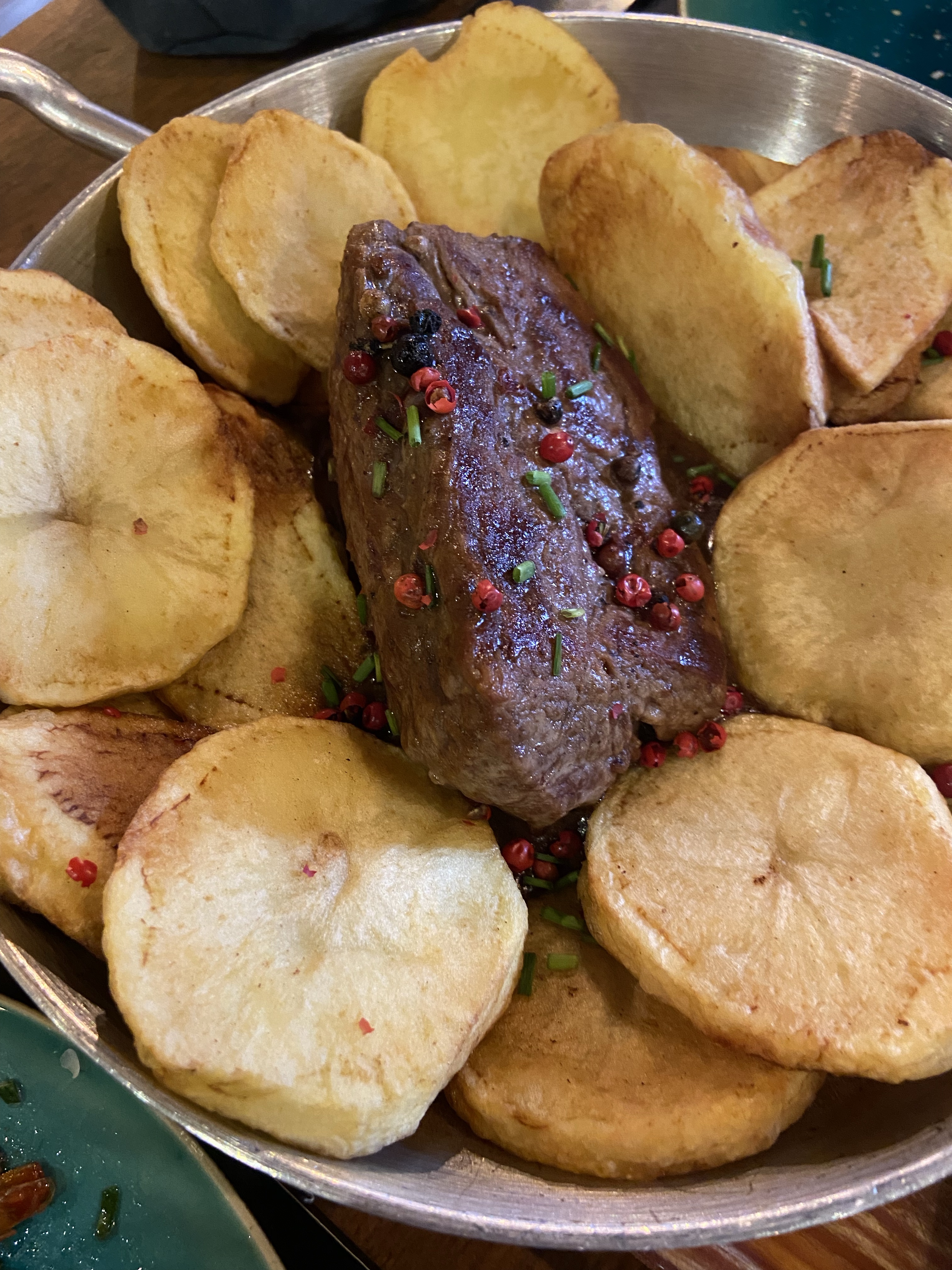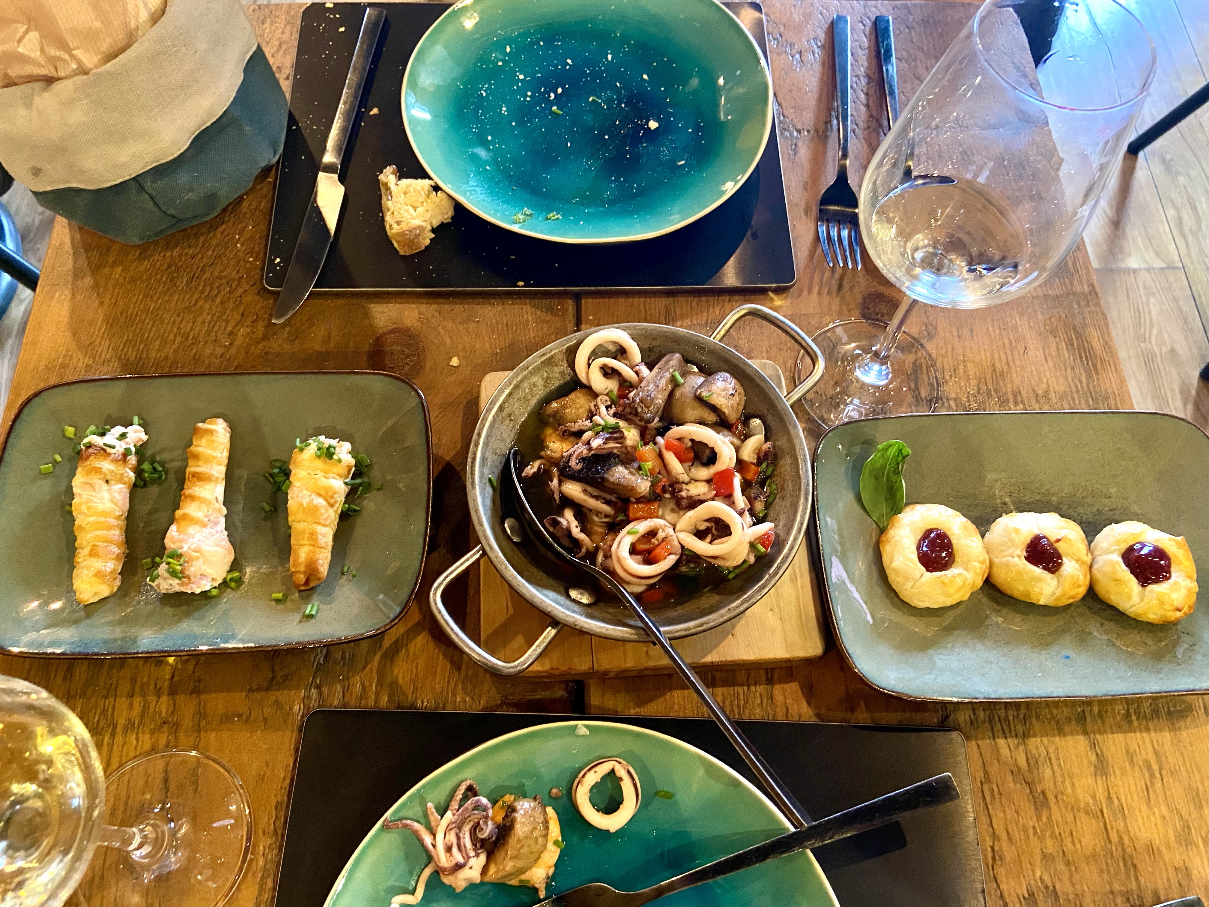 Mekanda epeyce hamurlu lezzet de mevcut. Tabii bunların bizdeki gibi yoğun hamurişlerinden ziyade, çıtır, milföylü lezzetler olduğunu vurgulamak gerek… Tıpkı keçi peyniri dolgulu, marmelat damlatılmış minik, çıtır börekler veya taze peynirle birlikte yufkaya sarılıp çıtırdatılmış somon gibi. İkisi de nefisti! Soğuk balık salatası hem büyük porsiyonuyla gözümüzü doyurdu, hem lezzetiyle midemizi. Ama ya o karışık deniz mahsulü sote… Ah o tabak… Bacaklı kalamarlar, lezzetli ahtapot ve karidesler, biraz mantar, tabii bolca zeytinyağı ve hafif baharatla efsanevi bir tabaktı. Günlerdir hem öğlen hem akşam deniz mahsulü yememizden dolayı Alp bu kez bir değişiklik yapıp klasik bir et yemeği söyledi, karabiber soslu, patatesli bir biftek. Doğrusu iyi ki söylemişiz, zira et de sosu da çok ama çok nefisti! Bir ülkede genel gıda kalitesi yüksek olunca sonuç da böyle oluyor tabii, insan ne yese hayal kırıklığına uğramıyor.