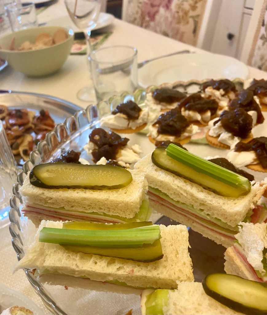 2- İkincisi, böyle sofraların olmazsa olmazı ton balıklı kanepe. İyi bir ton balık salatası, kanepe de olur, parmak sandviç de olur, ayrıca normal zamanda kocaman, lezzetli bir sandviçe de dönüşür. Ve birçok “iyi” ton balık salatası vardır aslında, sırf benim bile favori 3-4 farklı tarifim var. Bu epeyce kolay olan. Bir adet büyük boy konserve ton balığını, bir yemek kaşığı mayonez, bir yemek kaşığı salatalık turşusu suyu, bir tatlı kaşığı taneli hardalla karıştırıp ezdim. Karışıma iki yemek kaşığı minicik kareler halinde doğranmış mor soğan, ufacık kıyılmış yarım sap kereviz ekledim. İçine derotu, turşu salatalık ve taze salatalık da girebilir, ama turşuyu üstüne kullanmayı yeğledim, dereotu da diğer kanepede olduğu için koymadım. Ben çok ufak kıtır tuzlu bisküviler üstüne yerleştireceğim için salatalık sulandırırsa sorun olurdu, o yüzden eklemedim. Ama parmak sandviç veya normal sandviçe kullanacaksanız, minicik küpler halinde ekleyebilirsiniz.