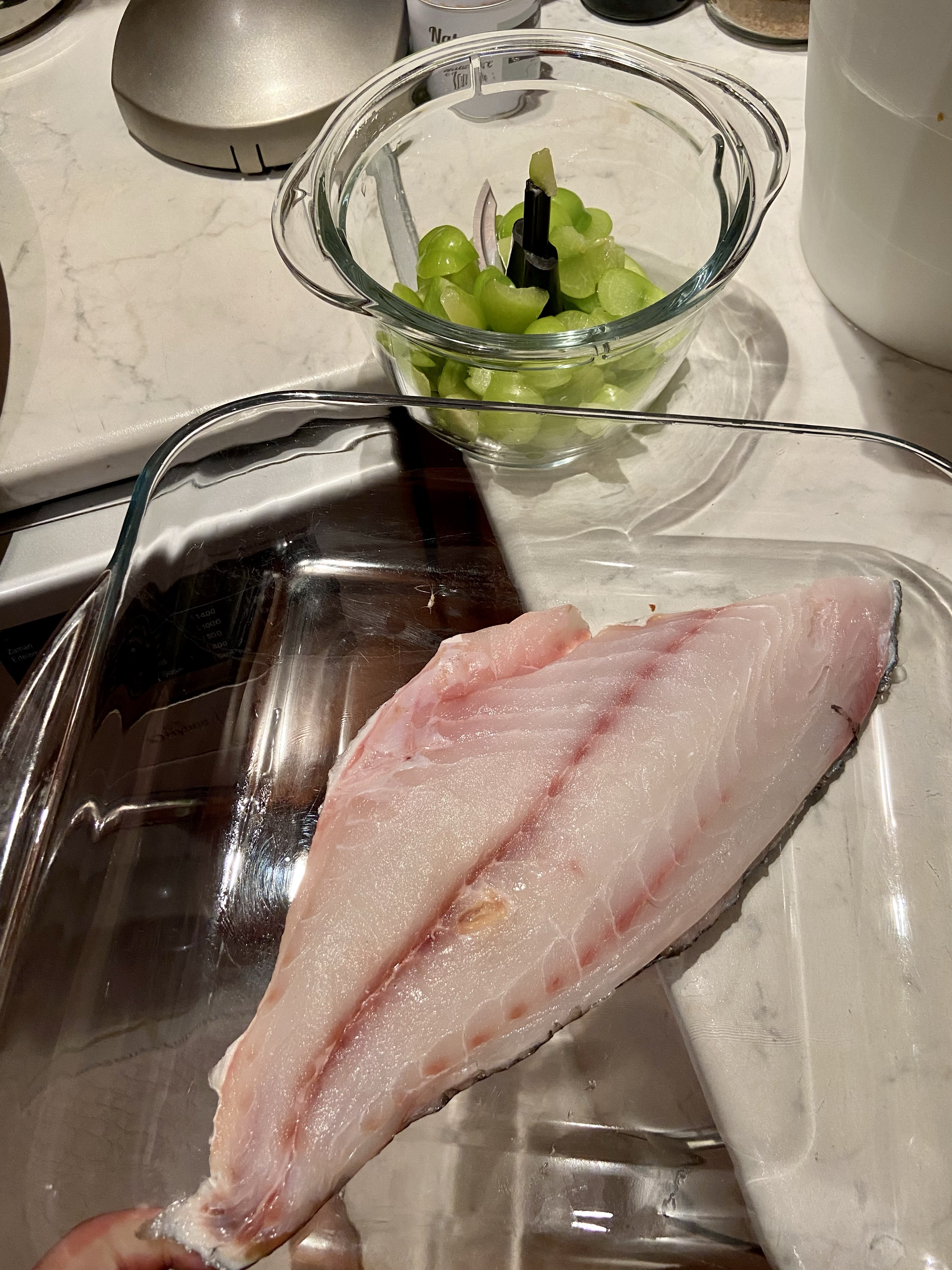 Tarif pek basit. Zeytinyağıyla yağlanmış bir tepsiye, sosu daha iyi çekmesi için fileto edilmiş çipurayı yatırdım, kendini yalnız hissetmesin diye orta boy bir soğanı ve muhtelif adette kereviz sapını doğrayıp yanlara serpiştirdim, üstüne tuz ve biber gezdirdim. On kadar yeşil eriği doğradım, bir diş sarımsak (balığı çok bastırmasın diye az koydum, isteyen arttırabilir), bir yemek kaşığı zeytinyağı, 5-6 iri yaprak fesleğen, tuz ve karabiberle çektim. İşte bu kadar basit. Ardından balığı sosla kapladım, kalanını da soğan ve kereviz saplarının üstüne serpiştirdim. Hoppa sıcak fırına, 20-25 dakika yetti bizim tombik çipuraya.