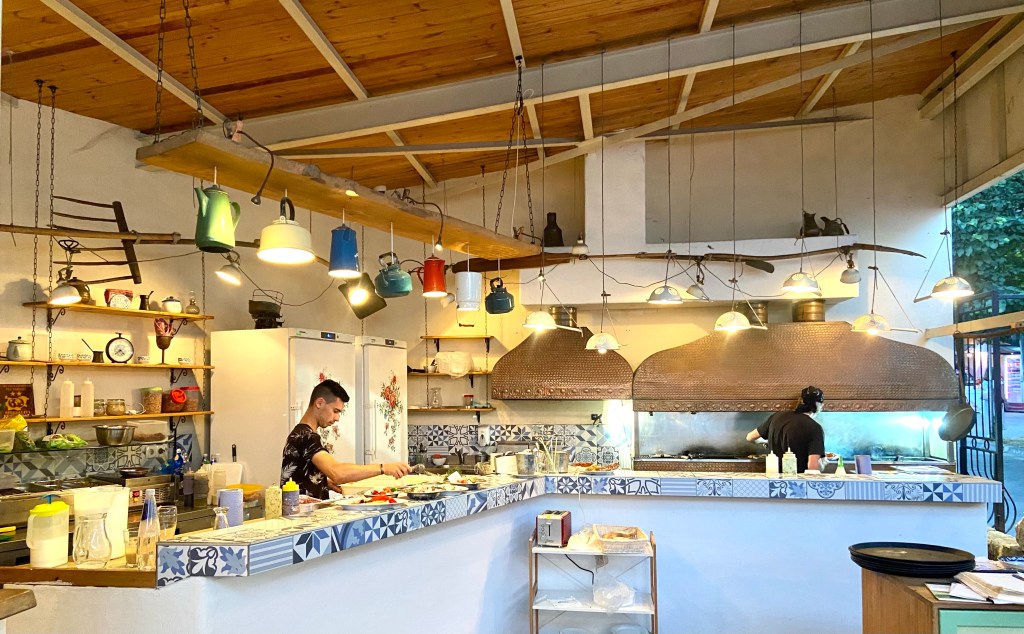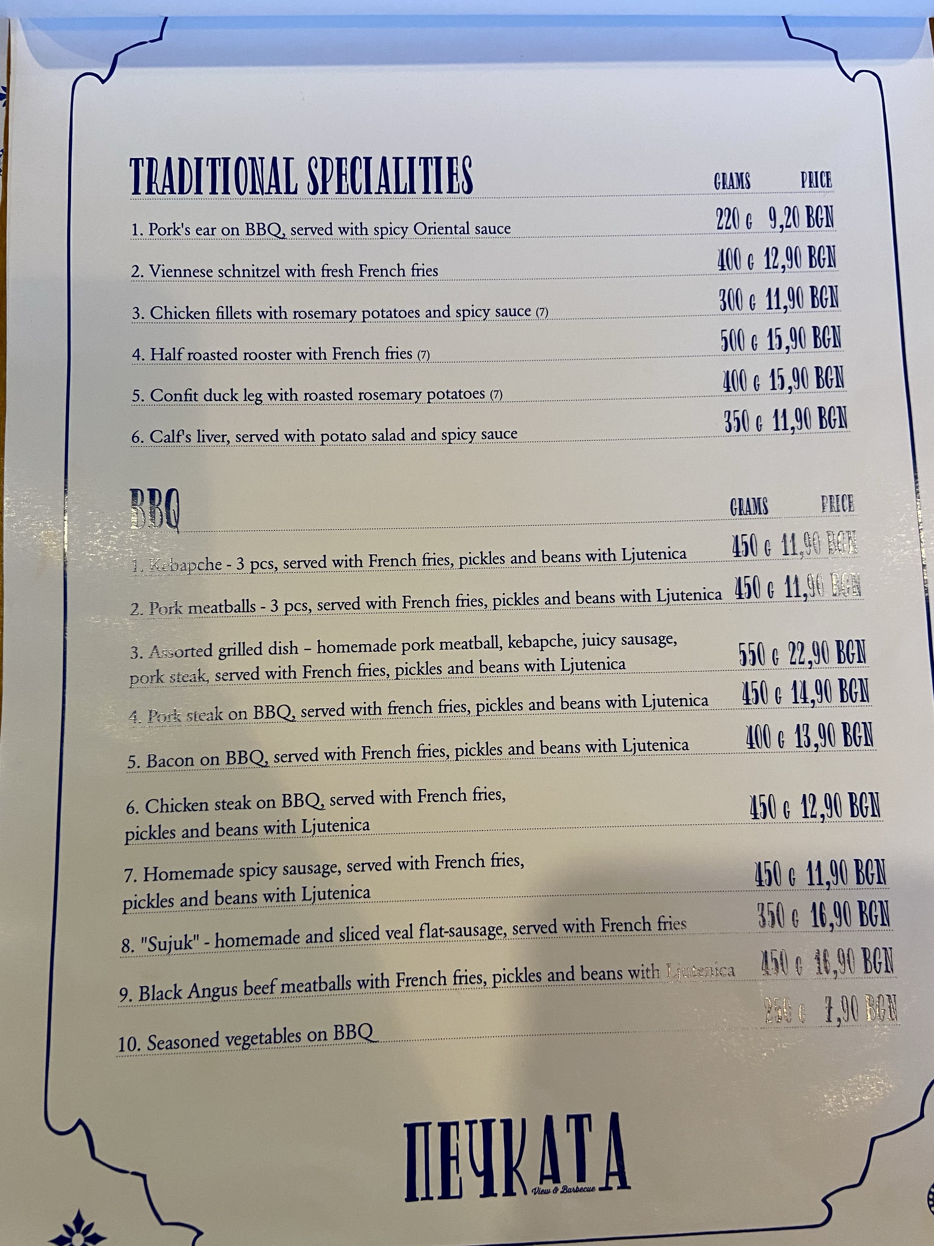 Pechka bildiğim nadir Bulgarca kelimelerdendi benim, “soba” demek, Pechkata ise “sobaya” anlamına geliyor. Mekan çok sevimli, bir de isminden dolayı mıdır nedir, sanki daha da bir tipik geldi bana atmosferi. Direkt mekan içinde bir taş fırın, açık mutfakta çalışan şefler, ortamın renkleri, hepsi hoş detaylar… Mekanın bir tarafı sanki bir evin salonuymuşçasına döşenmiş, ortadaki masalar küçük bir yolun iki tarafına sıralanmış hissi veriyor, ayrıca kumsalda da direkt denize baka baka yemek yemek mümkün.