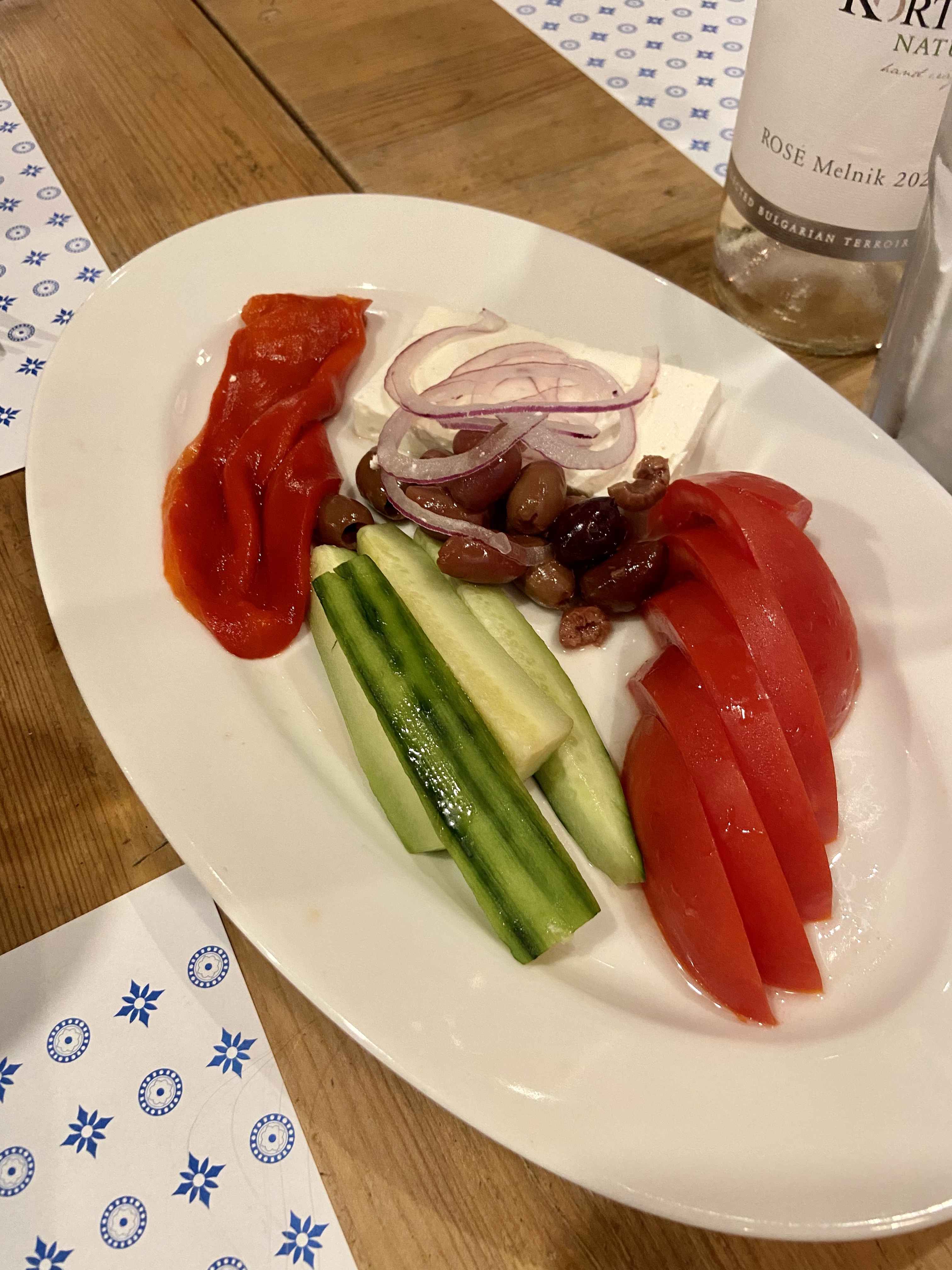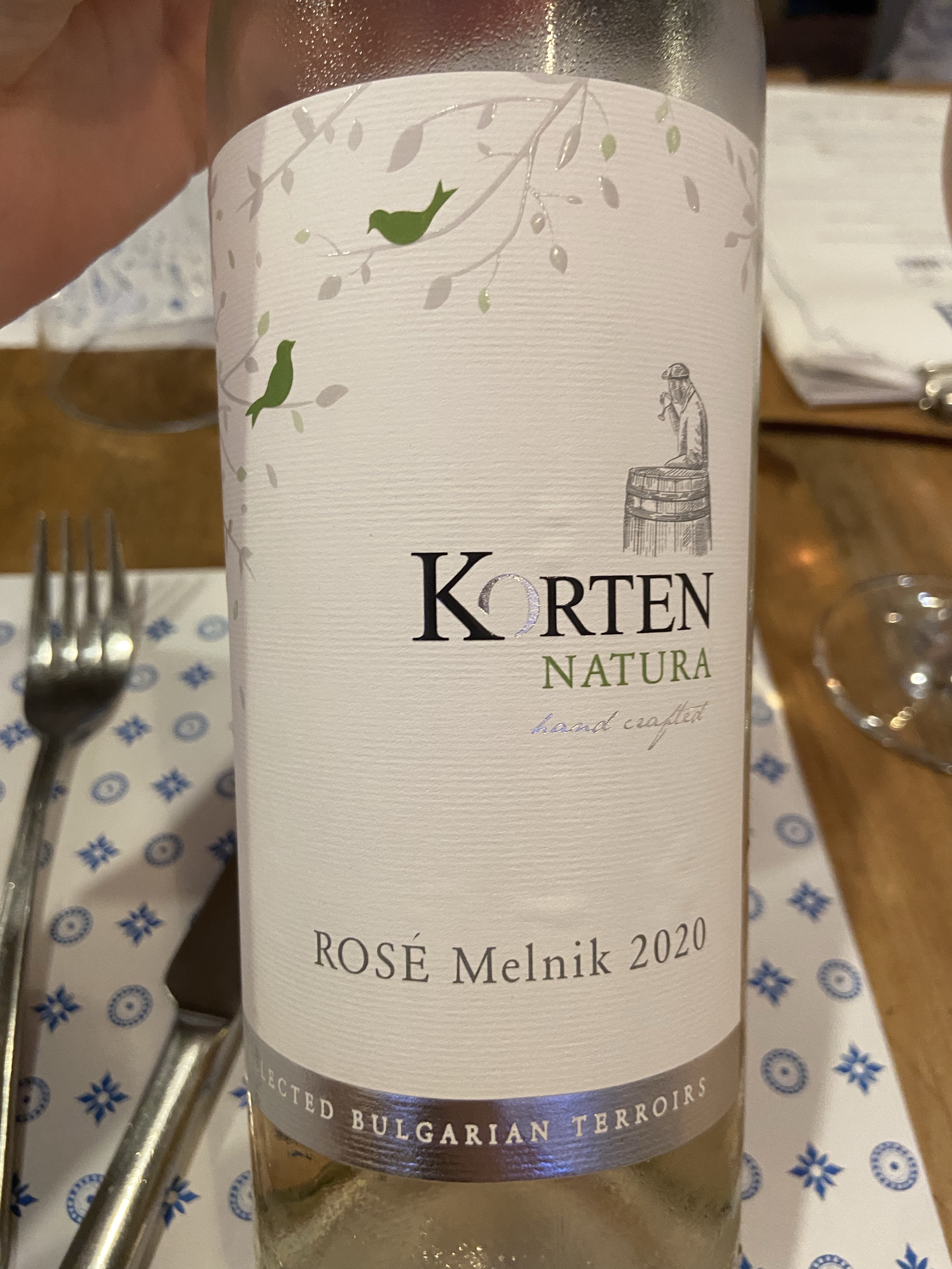 Yazıyı daha fazla “sağlık ve çevre konulu panel” haline getirmeden ibreyi şarap meselesine kırıyorum. Başlangıçta Türkiye ile Bulgaristan çok farklı yerlerde değildi belki, ama Bulgaristan bu konuda çok yol kat etmiş, elbette fiyat, sübvansiyon, vergi gibi avantajların çok işe yaradığı kesin. Hem ithal şaraplar Türkiye’den çok daha uygun fiyata, hem de yerli şaraplar arasında harika örnekler var; dolayısıyla hemen her yerde (Türkiye’de anca klas restoranlarda rastlanabilen) sayfalarca süren şarap menüleriyle karşılaşmak mümkün. Ben o akşam biraz inceledikten sonra yerli üzüm denemek istediğim için mavrud ve rubin üzümlerinden yapılmış, Melnik bölgesinden bio bir roze olan Korten’in rozesini seçtim ve beklentimin de çok üstünde bir şarapla karşılaştım. Çok diri ve neşeli bir şarap; kiraz, kırmızı ve siyah meyveler, erik notaları belirgin, bunların yanı sıra ben çok net şekilde gül ve benzeri çiçek kokuları aldığımı hissettim. Asiditesi dengeli, içimi kolay, lezzetli bu şarabı bir yaz gecesinde içmek belki de en doğru tercih! Gerçekten çok mutlu etti.