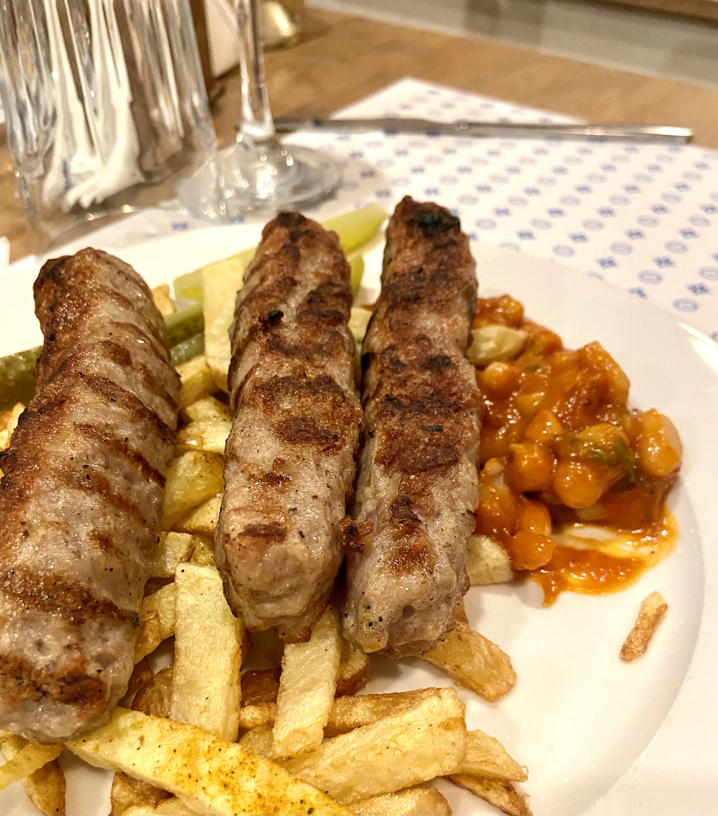 Tabii Bulgaristan’ın en ünlü yemeklerinden biri kebapçe. Şişlere geçirilerek ve ateş görerek pişirildiği için adını bir pişirme yöntemi olan “kebap etmek”ten alan (yani aslında “yemek olan kebap”tan almayan) bu yemeği Türkiye’deki kıyma kebaplara benzerlik beklentisiyle yerseniz biraz hayal kırıklığına uğrayabilirsiniz. Aslında bu daha ziyade souvlaki’ye benzeyen bir kebapçık zira (evet, çe=çık). Buradaki de iyi bir kebapçe örneği. Baharat kullanımı genelde bu civarlarda olduğu üzere yok denecek kadar az. Porsiyonu da Türkiye’deki 1,5 porsiyon kebaba denk!