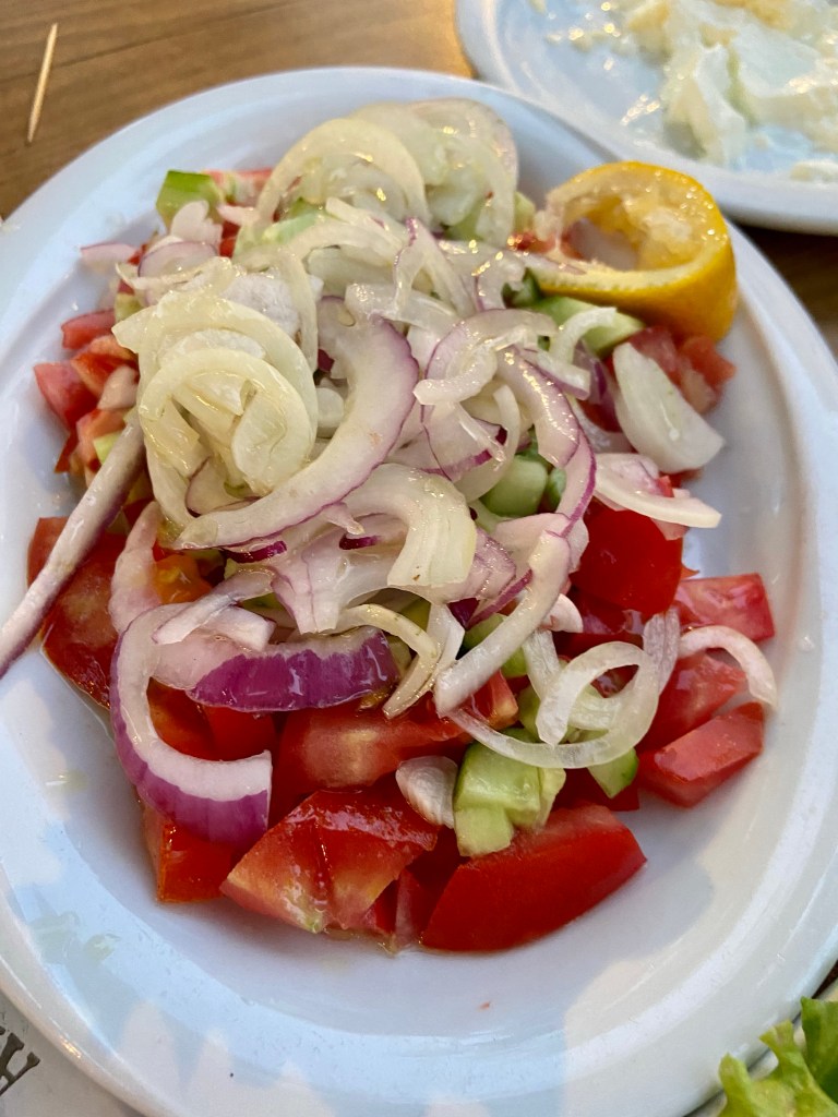 Üç kişi, dışarıdaki çınar ağacına nazır masalardan birine oturup bir porsiyon antrikot ve 2,5 porsiyon kuzu şiş söylüyoruz. Yanında tabii ki soğanlı bir çoban salata ve kesme yoğurt. Önden birimiz çorba alıyor, ayrıca yoğurtlu biber kızartmadan da istiyorum. Başka çok meze varmış ama biraz geç saatte vardığımızdan bazıları bitmiş, sağlık olsun. Gelen yoğurt bir kere harika, kalıp gibi, sarımsı kaymaklı, şahane bir yoğurt. Bir yoğurt delisi olduğum ve salata yanında yoğurdu çok sevdiğim için et gelene kadar kendimi tıkamamak için biraz uğraşmam gerekiyor! Sonra etler gelince çok doğru bir karar verdiğimi anlıyorum zira kuzu şiş nefis! Et kesinlikle alıştığımızdan daha aromatik. Marinasyonu, dinlendirmesi iyi, pamuk gibi. Hiç kurutulmadan pişirilmiş. Alp de kuzu antrikotundan çok memnun. İkimiz de burada kesinlikle birçok ünlü yerden çok daha iyi et yediğimiz konusunda hemfikiriz. Yeğen beyler de 1,5 kuzu şişi afiyetle yiyip antrikota sulandığına göre “etçil” bir birey olarak halinden memnun!