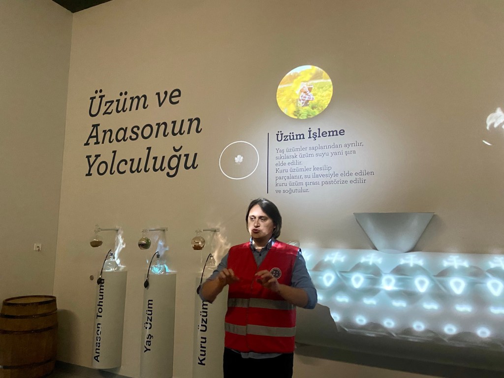 Mey İçki’nin Alaşehir üretim tesislerinde, üzümlerin işlenerek önce mayşe, sonra suma halinde depolandığı “rakı bacaları” (bence çok tatlı isim oluyor!), damıtımın gerçekleştiği imbiklerle Damıtımhane, bir de küçük imbiklerle artizanal denemeler diyebileceğimiz denemelerin yapıldığı Yenilikhane yer alıyor. Damıtımhane ile Yenilikhane’nin bulunduğu Deneyim Merkezi’nde pek havalı bir tadım odasıyla konuklara rakının yapılış sürecinin anlatıldığı, çok hoş dizayn edilmiş bir hol de var. Tesisi gezerken mekanlar kadar etkileyici olan diğer faktör de anlatılanlar: Koray Özcan’ın rakıdaki üretim ve inovasyona yönelik teknik anlatımlarını Ayça Budak’ın içki kültürüne ve tarihine yönelik anlatımları tamamlıyor, ki harika bir ikili olduklarını söylemem lazım, ikisinin de alanında ne kadar yetkin kişiler olduğunu bilmeseniz bile dinlerken anlayabilirsiniz.