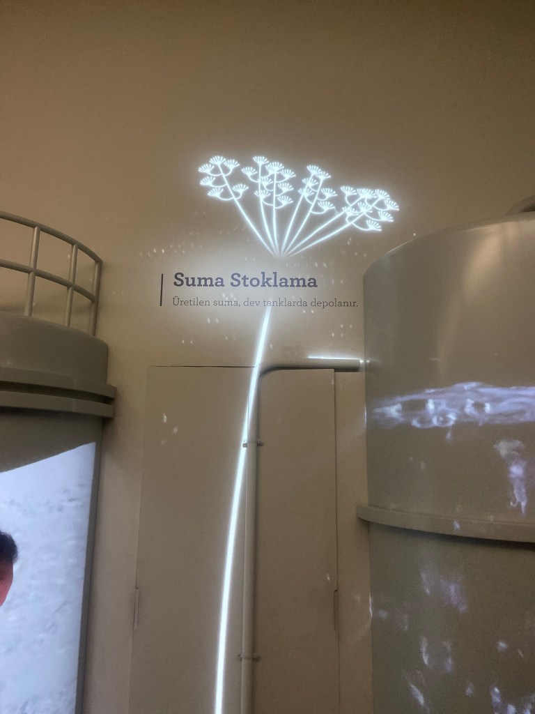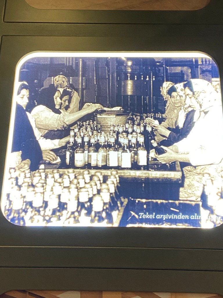 Tadım notlarımızı işledikten, duyusal analizlerden konuştuktan sonra bu çok keyifli sohbeti bitirip masadan kalktık ve rakı üretiminin anlatıldığı hole geri döndük. Biz girdiğimizde sağ yanı aydınlatılmış olan bu holün şimdi sol yanından geçerken, “rakı” deyince neredeyse hepimizin aklına gelen kişiliklerden ilhamla yaratılmış bir kısa film oynuyordu duvarda, önünde ise TEKEL zamanından başlayarak, yurtdışına özel sunulmuş şişeler de dahil, tüm şişeler sıralanmıştı. Nefis bir zaman tüneli… Hakikaten bu deneyim merkezini, ama bilhassa da bu holü kimler tasarladıysa akıllarına sağlık, hem seçimler hem de uygulamaları çok başarılı.