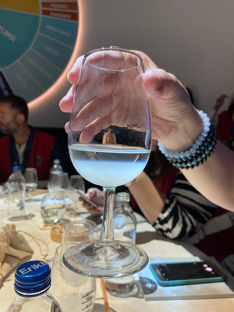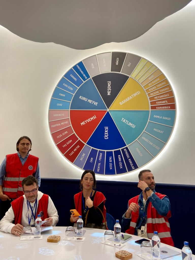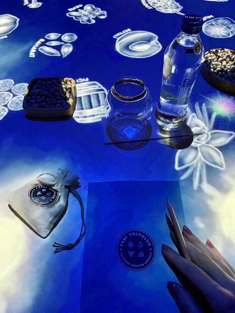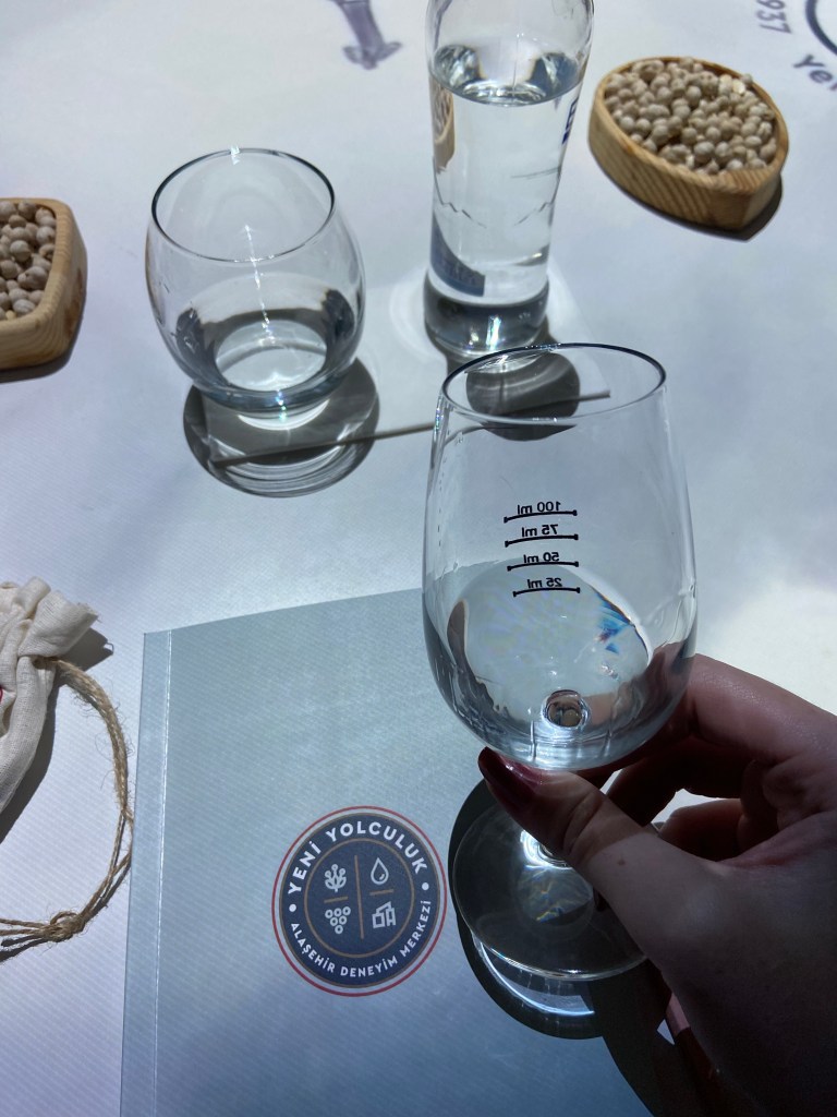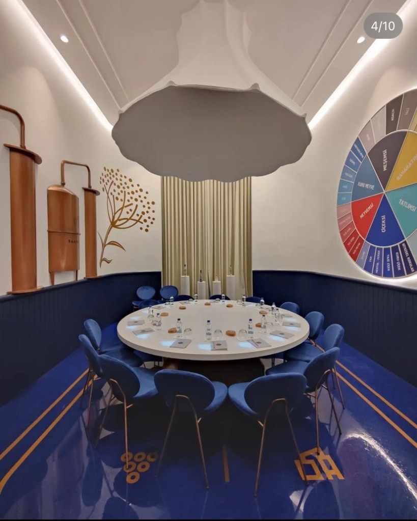 İlerleyen zamanlarda bizim karşımıza ne gibi güzellikler sunacaklarını merak ettiğimiz Reyhan ve Saadet Hanımları ardımızda bırakarak, Refik Anadol’un bir dijital eserinin sergilendiği bölümden de geçerek tadım odasına girdik. Kapıların açılmasıyla beliren ve üzerine gerekli her şeyin dizildiği bu yuvarlak masayı görünce yuvarlak masa şövalyeleri esprileri yapmamak imkansızdı, yapıldı, pişman değiliz! (Burkay masanın fotoğrafını koyunca “Dünyayı yöneten ailelerin buluşma salonu gibi” diyen arkadaşa da selam, en güzeli onunkiydi!) Rakı aralarında ağzımızdaki tadı temizlemesi için beyaz leblebi, su, rakı çeşitleri ve üzeri ölçülü tadım kadehlerinden başka bir yiyecek içecek bulunmayan bu masada, tasarımını çok beğendiğim ve içine yerleştirilen notları çok akıllıca bulduğum Yenilikhane defterleri de tadım notlarımızı yazalım diye bizi bekliyordu. Daha önemlisi ise duvarda yer alan rakıya özel duyusal çemberdi. Normalde yine şarapta aşina olduğumuz ama söz konusu rakı olunca üzümü hiç konuşmadığımızdan, bunca yıl rakının duyusal çemberi hazırlanmamış. Bu konuda Mey öncü olmuş ve sonuçta dünyanın yeme içme alanında en önemli hakemli dergilerinden Foods’ta bu çember bir makaleye konu olarak dünyadaki diğer araştırmacıların da bilgisine ve ilgisine sunulmuş. İşte bu da, tıpkı Mey’in geliştirip tescil ettirdiği Yeni 37, Ege 53 ve Altın 8 anasonları gibi muazzam bir gelişme, ülke gastronomisi ve içki kültürü adına ciddi katkılar, emeği geçenlerin ellerine sağlık.