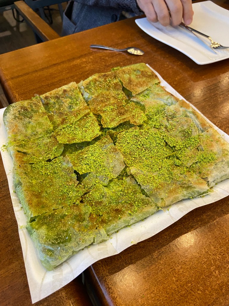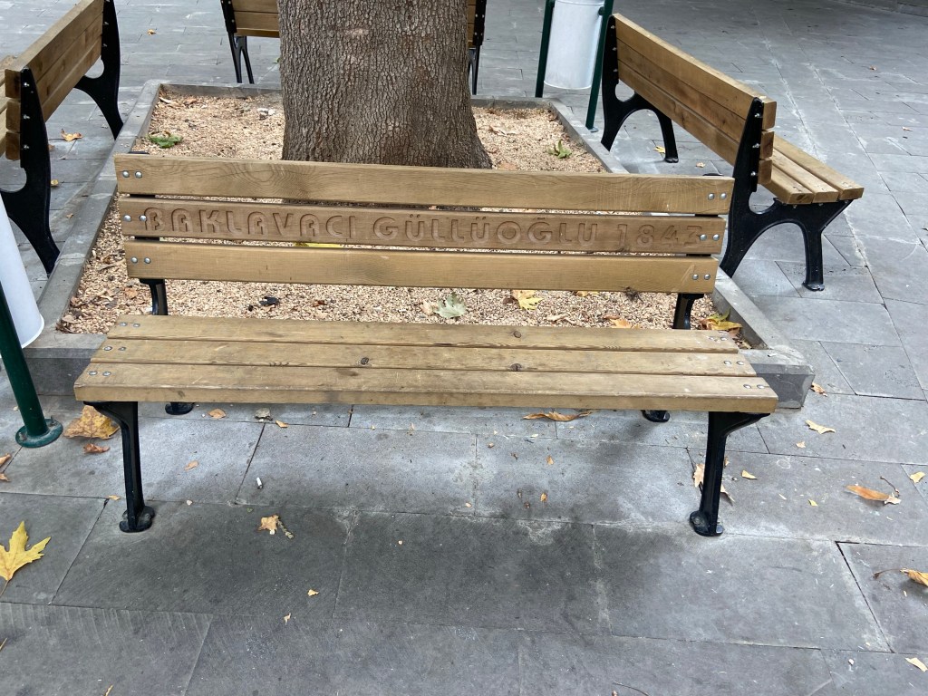 Bunları düşünüp dururken, bir başka caminin avlusundaki banklar dikkatimi çekiyor, üstünde “Güllüoğlu” yazıyor bankların. Şehrin her yerine baklava damgasını vurmuş derken tam bunu kastediyordum işte, alakasız bir yerde oturup dinlendiğiniz bankta bile bir baklavacı adıyla karşılaşabiliyorsunuz.