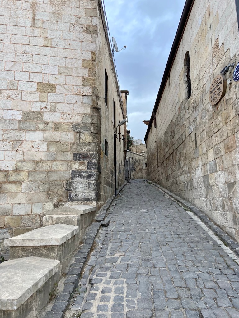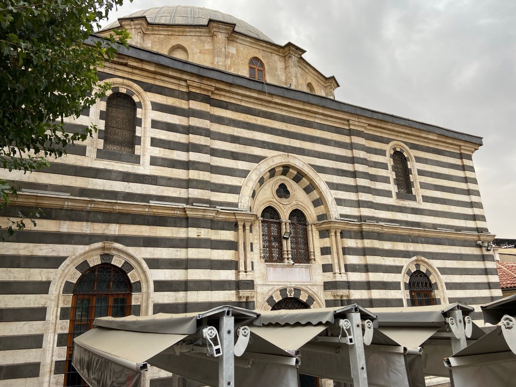 Gerek çarşının hemen bitimindeki camiide olsun gerek şehirde dolanırken rast geldiğimiz diğer camilerde olsun, Antep kültürünün en önemli bileşenlerinden olan Ermeni mimar etkisini görmek mümkün. Çoğu camiide hem kiliseden dönüştürülme izleri hem de genel olarak yapılarda daha gotik ve barok stillerinden alıntı özelliklerle karışık kullanılan eklektik düzenlemelere rastlamak mümkün. Yer yer Diyarbakır’a da çok benzettiğim Antep’te, şu siyah-beyaz renkler de mesela Marsilya’daki yapılarla kardeş… Dünyadaki farklı şehirlerin bazen bir anda çok farklı, bir anda ise ne kadar benzer olduğunu düşünmek hoşuma gidiyor.
