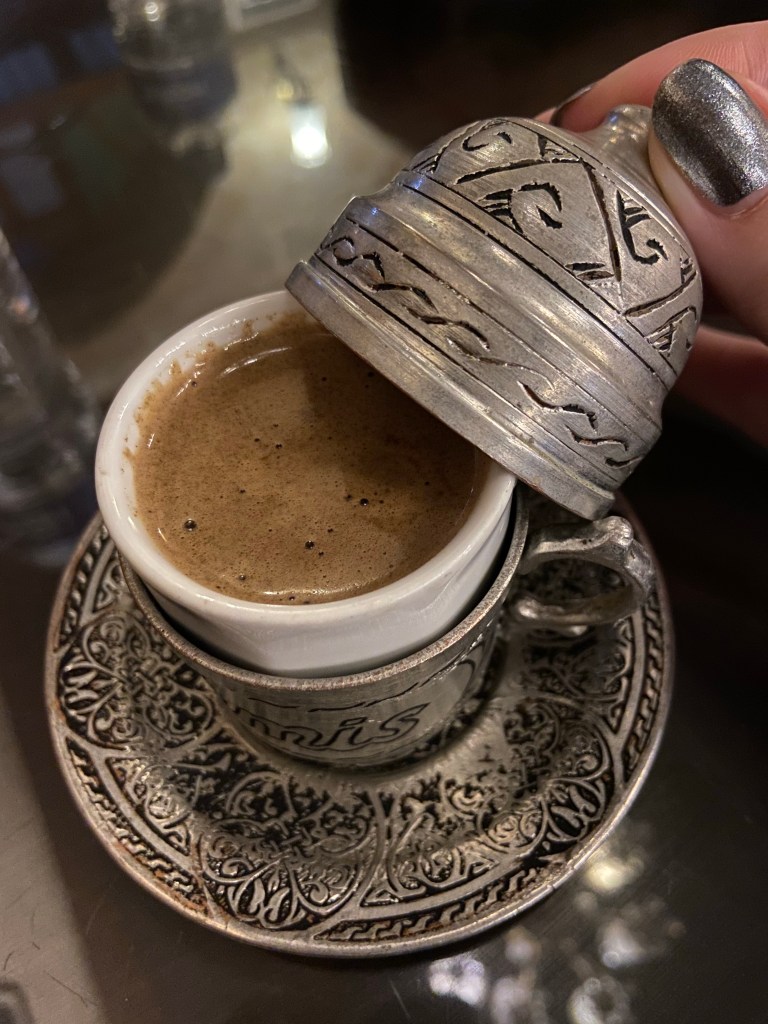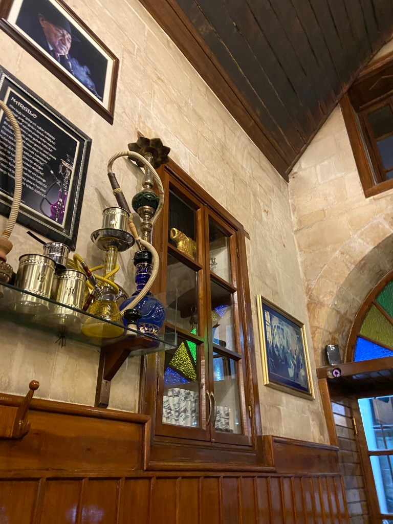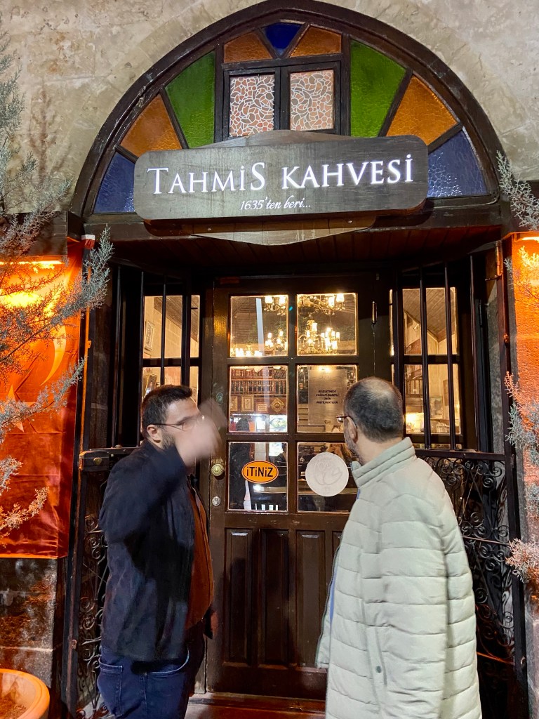 Dolandıktan sonra bir nefes almaya Tahmis Kahvesi’ne oturduk. Burayı gidenlerden hep duymuşsunuzdur, ama bence hakkıyla anlatılmıyor: Anlatıldığından çok daha güzel! Güzelliği de havasında, zira burası bir “kafe” olmamış hâlâ -şükür!-, insanları elinde gazete, önünde kahvesiyle otururken hayal etmek epeyce mümkün yine. Neden bilmem, içerisi çok benzemediği halde -herhalde havasından olacak- bana Erenler’i hatırlattı. (İstanbul Üniversitesi’nde okumuş olanlar Çorlulu Ali Paşa Medresesi’ni iyi bilir!) Ahşap kaplamalar, girişteki renkli camlar, ama en güzeli, nefis bir menengiç kahvesi… Başka yerlerde de içtik bu kahveden, fakat cidden Tahmis’inkini daha nefis. Acelesiz bir zamanda yine gidip, mümkünse tek başıma, hiç konuşmadan, uzun uzun oturmak isterim burada gündüz saatlerinde.