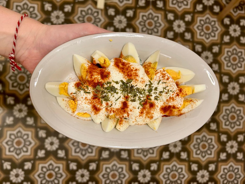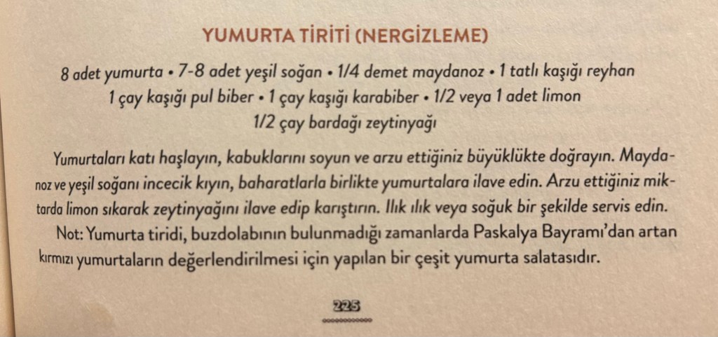 Peki ya nergizleme ne? O da, Silva Özyerli’nin tarifini verdiği bir Diyarbakır mezesi. (Diğer adı yumurta tiriti, ama ben nergizleme adını çok daha fazla beğendiğim için öyle söylüyorum.) Yoğurtsuz olan bu yumurta salatası, aslında tam da bugün benim yaptığım gibi Paskalya yumurtalarıyla yapılıyor, tabii içine baharın yeşillikleri de giriyor.