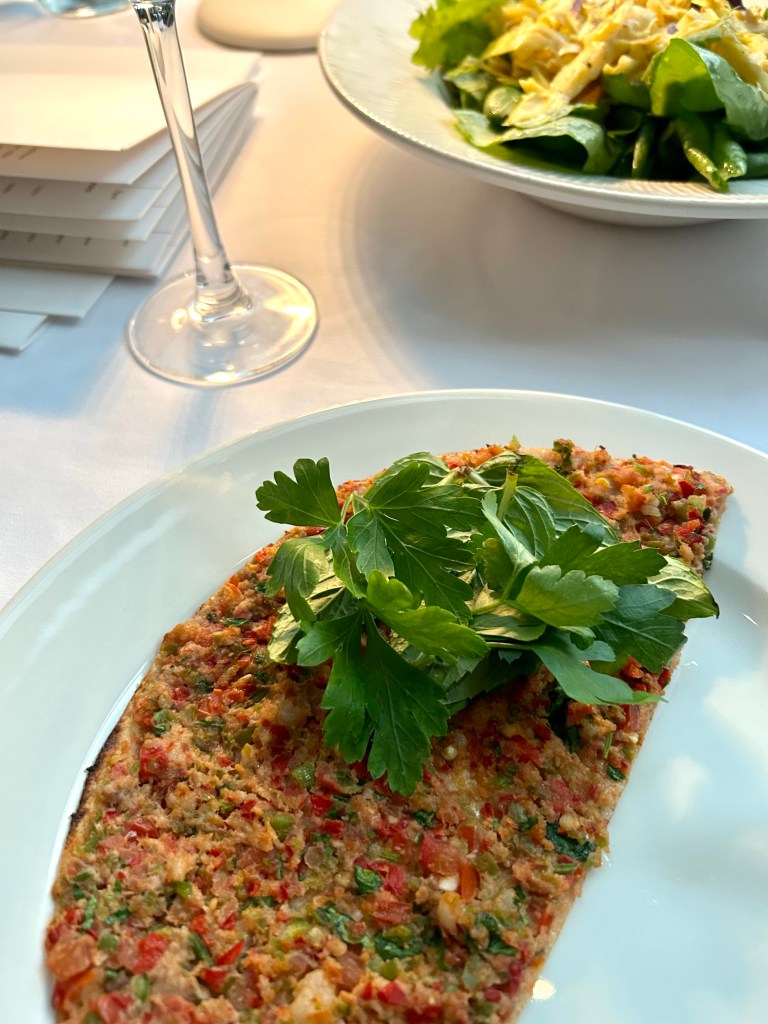 İşte Seraf bu manada bence gerçekten alanında tek. Mahmutbey şubesi de her zaman özenli ve şık, ancak Vadi’deki restoranın şıklığı, tasarımı çıtayı bambaşka bir yere taşımış. İnsanın canı geleneksel Anadolu mutfağı çektiğinde en iyi örneklerini en güzel ortamda yiyebilmesini, misafiri varsa (bilhassa yabancı misafirler) gönül rahatlığıyla ağırlayabilmesini, en güzel içkilerin bu lezzetlere eşlik edebilmesini sağlayacak bir konsept oluşturulmuş ve bu anlamda İstanbul’un ilk örneği olmuş. Aydınlık, yeşilliklere bakan, art-deco detaylarla üslup sahibi bir mekan yaratılmış, belli ki tabağının tasarımından açık mutfağın üstünü süsleyen ünlü çizer Sedat Girgin’in eserine kadar her detay düşünülmüş, tıkır tıkır işleyen bir servis yaratılmış, hem Mahmutbey’in imza tatlarını hem de bu şubeye özel tatları içerecek yeni bir menü çalışılmış. Her gittiğimde mutlaka yediğim içli köfteyi yeniden bulmak bu anlamda mutlu etti, keza lahmacun da Seraf’a her gittiğimde masaya söylediklerimden. Ancak narenciyeli enginar salatası ile ilk kez müşerref olduk ve çok beğendik. Nasıl ferah, nasıl bahar gibi bir lezzet… Soğan dolması da yine klasiklerden, fakat altı ezmeli lüle kebap ile yine ilk kez tanıştık. Kuzunun lezzetini mükemmelen yansıtan ve yanında minicik lavaşlarla gelen lüle kebaba bayıldık!