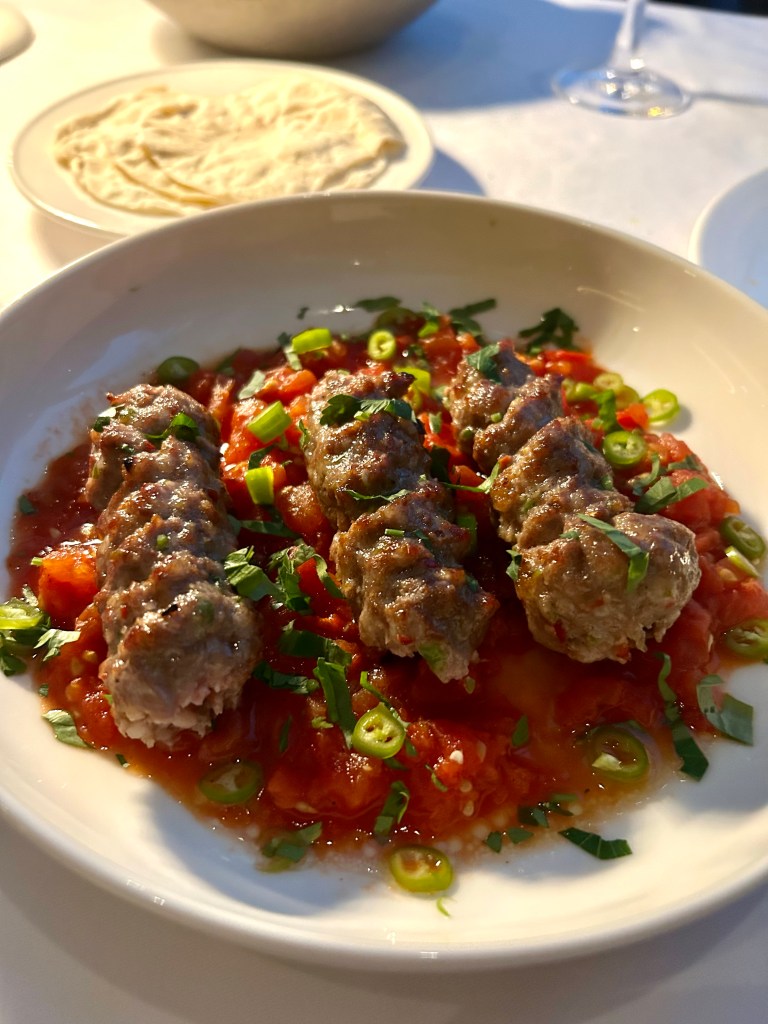 Daha da bayıldığımız ise bize önerilen eşleşmelerdi. Hayatınızda içli köfteyi hiç köpüklü şarapla denediniz mi bilmiyorum, zira ben de ilk kez denedim ve Sabiha Hanım’ın yarattığı bu eşleşmeye şapka çıkardım, meğer içli köfte köpüklülerle ne kadar güzel oluyormuş! Keza soğan dolması da Yaşasın’la harika uyuştu. Lüle kebabı içinse Pendore Öküzgözü’nü önerdiler. Öküzgözü, üzüm olarak bölgeye yakın ve yemekleriyle zaten uyuşması beklenebilecek nitelikte, ama Pendore bağları malum Ege’de, bu da üzümün karakterini değiştiren bir teruar etkisi demek. Fakat tamamlayıcılık açısından yine çok memnun kaldığımız bir eşleşme oldu, normalde kırmızılarda fıçı dokunuşunu seviyorum itiraf etmek gerekirse ve Pendore Öküzgözü daha meyvemsi bir şarap. Fakat eşleşmelerde benzerlik kadar zıtlıkların vurgusundan da hoşlanıyorum, o yüzden güçlü bir kuzu etinde yoğun, baharatlımsı bir kırmızı şaraptansa bazen daha meyvemsi olanlar da güzel eşleşiyor; nitekim bu eşleşmeyi de beğendik.