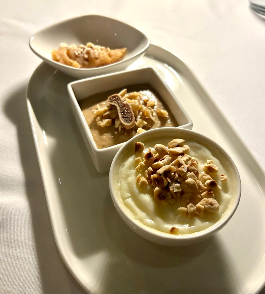 Birbirinden güzel tabaklardan sonra biraz mola verdik, restoranın kalan kısımlarını da gezip canım Sinem ile sohbet ettik. Bize Vadi’nin menüsü ile Mahmutbey’in menüsü arasındaki farkları anlattı, ileride de hem ortak yemekleri hem ayrı menüleri olacağını söyledi. Sıra çay kahveye gelince elbette yanına tatlı da eşlik etti. Normalde Mahmutbey’de hep irmik helvası yerdik, burada tatlı seçimini Sinem’e bıraktık, o da tatlı tadım tabağı le mukabele etti: Helva, ilave şekersiz incir uyutması ve sütlaç. Sütlaç normalde çok sevmem, ama sütünün lezzetinden dolayı bu sütlacı zevkle yedim. İncir uyutması ilave şekersiz olduğu için bana pek uymadı (ben tatlıyı tatlı severim!) ama pek çok insanın fazla şekerli olmayan tatlılar tercih ettiğini biliyorum, o açıdan onlara uygun bir alternatif olmuş. Helvaya gelince, dediğim gibi, ben zaten Seraf’ın helvasını çok severim. Hepsi de kendi tarzında başarılı, geleneksel tatlılar…